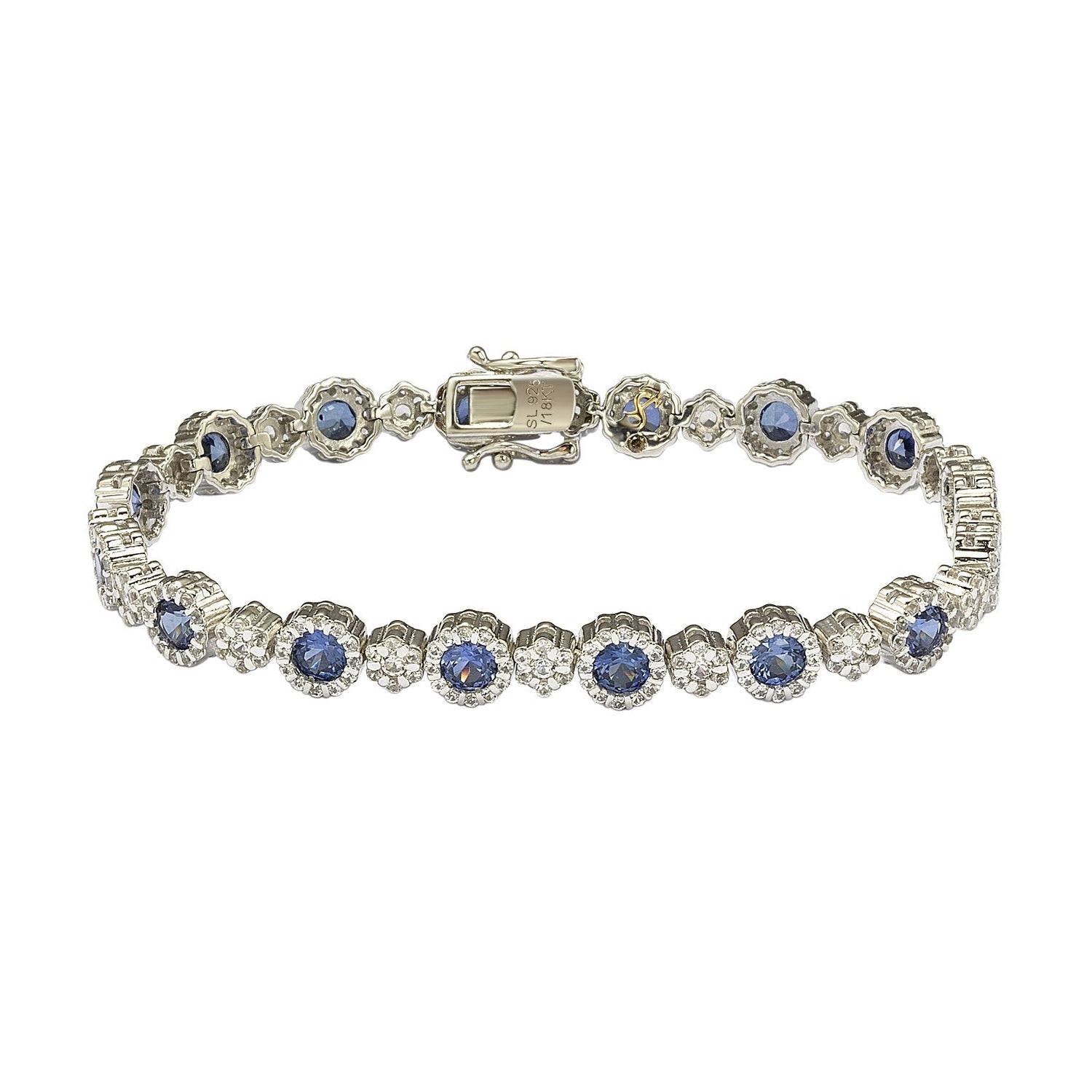 This Sterling Silver Sapphire and Diamond Accent Bracelet by Suzy Levian is a breathtaking display of regal elegance. A series of round-cut blue sapphires (5.44cttw) is set in a halo of created white sapphires (0.96cttw), with delicate created white sapphire flower clusters (0.84cttw) connecting each stone. The sterling silver setting and 18K yellow gold SL logo add a luxurious touch, while a hidden brown diamond in the back gallery reinforces Suzy Levian’s signature message of empowerment.