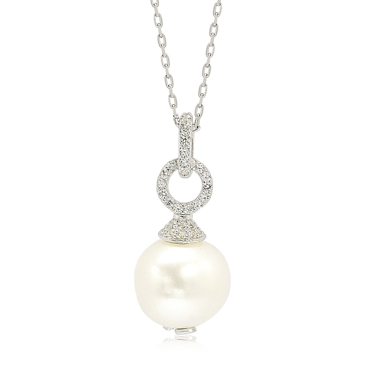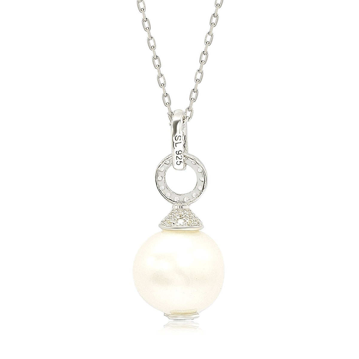 Sterling silver with high-polish finish. 10mm white cultured freshwater pearl. Pave-set created white sapphires. Signature SL logo at the bottom.