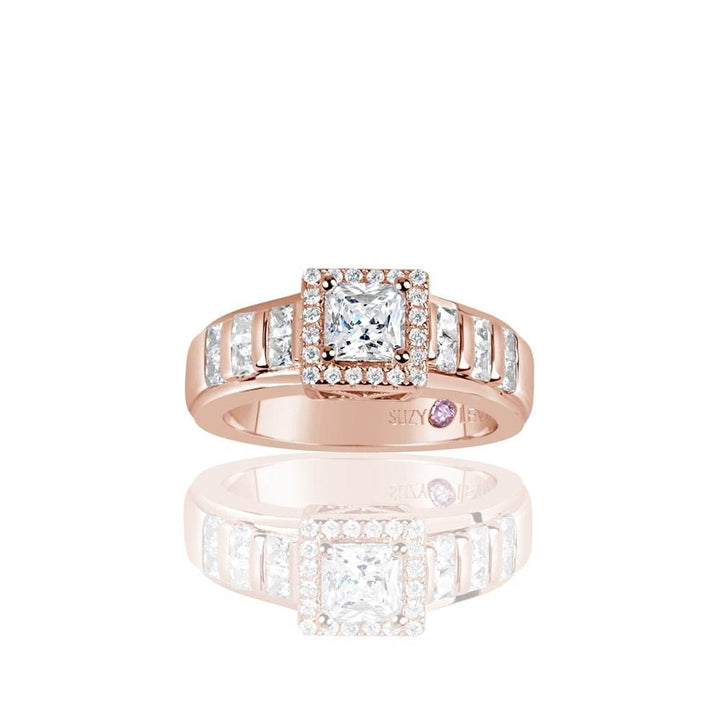 This Rose Plated Sterling Silver Asscher Cut Cubic Zirconia Engagement Ring by Suzy Levian features an asscher-cut white cubic zirconia center stone, surrounded by a halo of pave-set round cubic zirconia. The band includes channel-set side stones, creating a perfect blend of sophistication and elegance. The rose gold-plated sterling silver finish and two-tone plating add a luxurious touch, while the hidden pink cubic zirconia in the shank represents inner strength.