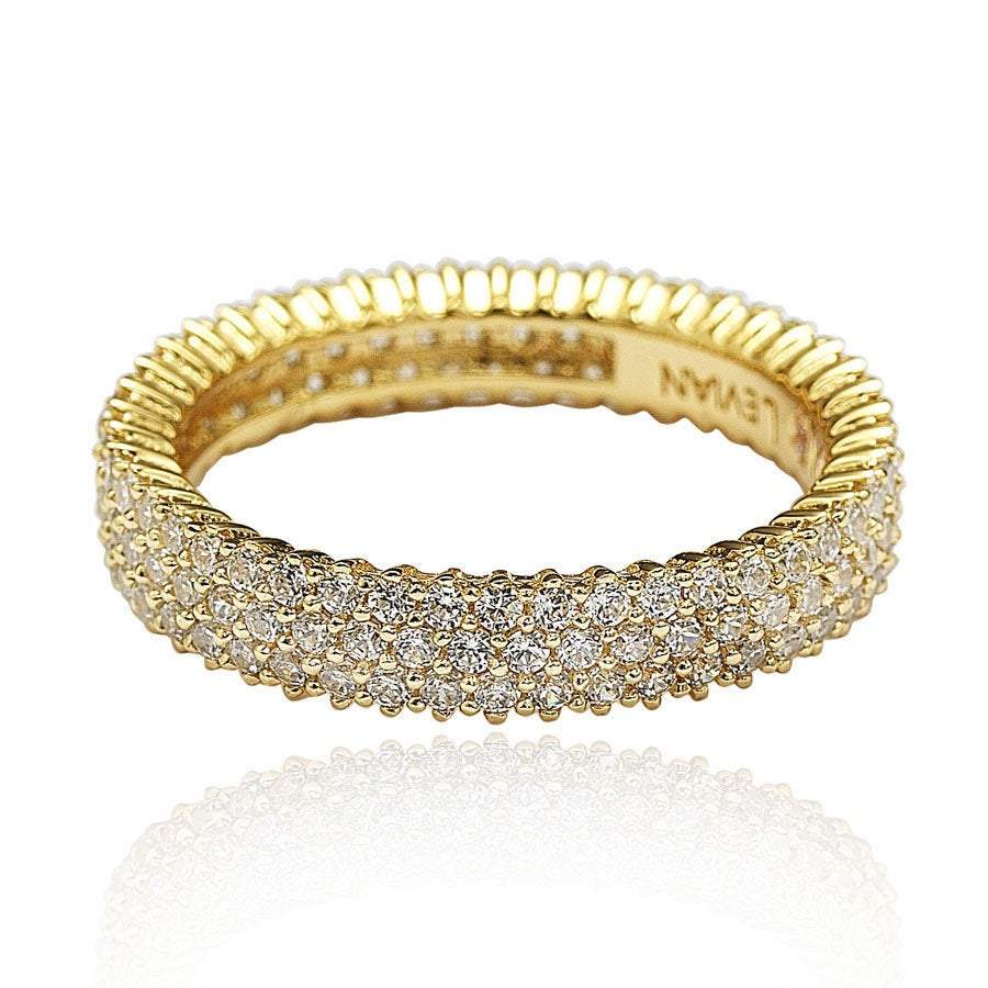 This Golden Sterling Silver Micro-Pave White Cubic Zirconia Eternity Band by Suzy Levian features 130 round-cut white cubic zirconia hand-set in yellow-plated sterling silver. The eternity band symbolizes everlasting love and is perfect for stacking or wearing alone. The Suzy Levian designer gallery and a hidden gemstone in the shank represent inner strength and beauty.