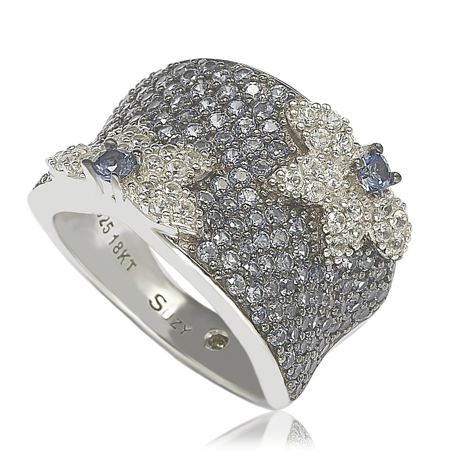 This Sapphire & Diamond Accent Sterling Silver Floral Ring by Suzy Levian features natural blue sapphires creating a garden with white sapphires representing flower petals. The center is highlighted by larger blue sapphires, symbolizing strength. The ring is crafted from 925 sterling silver with a smooth, high-polish finish and includes a hidden brown diamond in the shank.