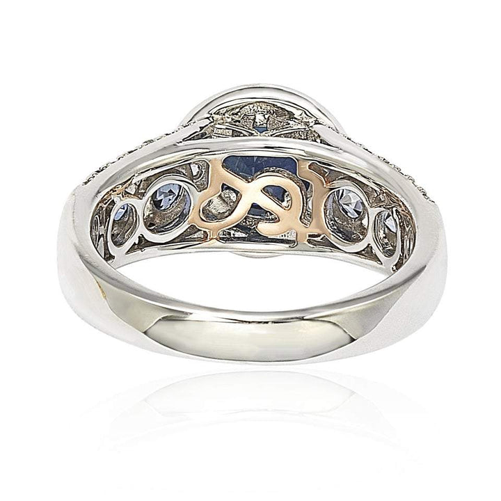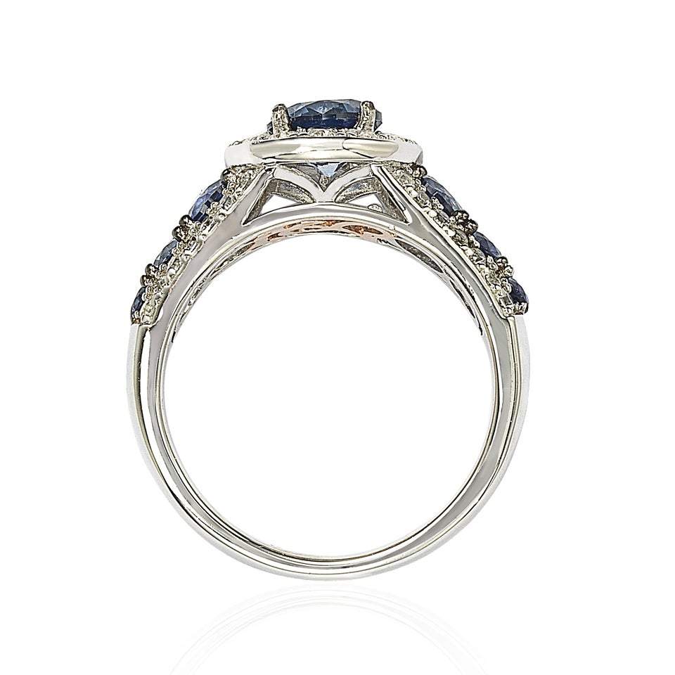 This Sterling Silver 3.61ct TGW Sapphire and Diamond Bridal Engagement Ring by Suzy Levian features natural blue sapphires (2.41 ct) and created white sapphires (1.18 ct) set in a high-polish sterling silver band. The ring includes a hidden brown diamond in the shank, designed to empower women to find their inner strength. The band features a solid 18k gold accent for added luxury.