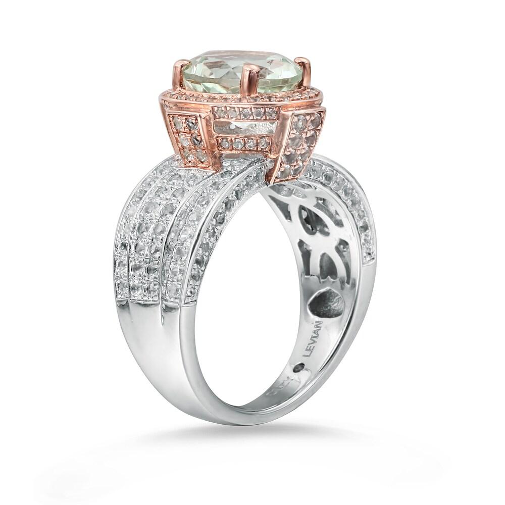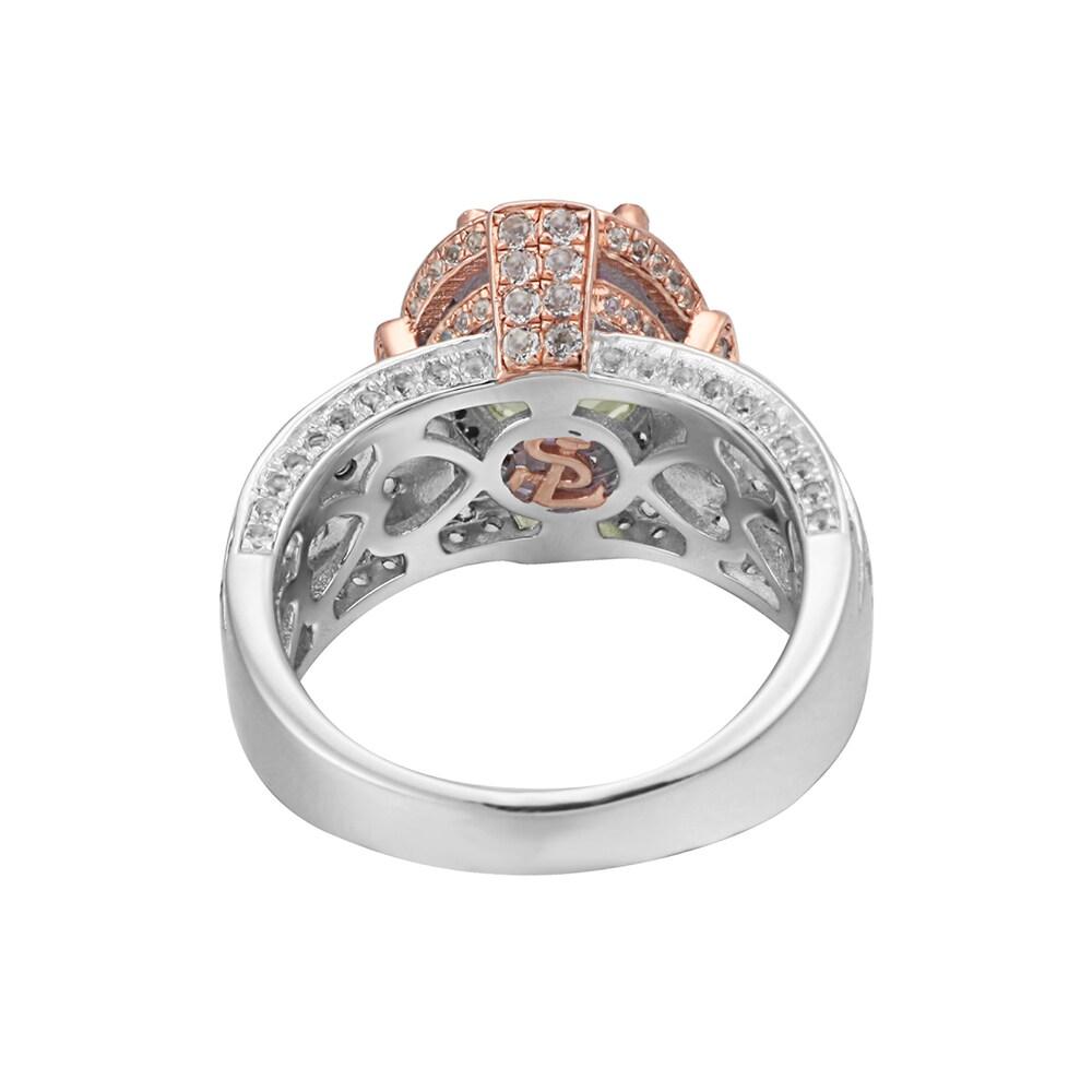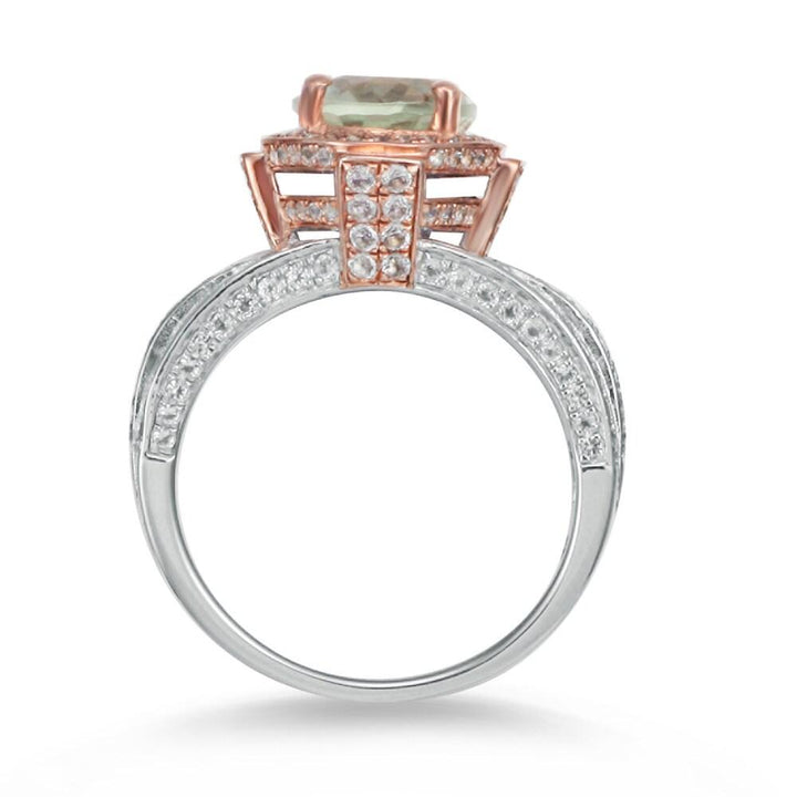This Two-Tone Sterling Silver 4.73 cttw Green Amethyst Ring by Suzy Levian features a stunning 2.38-carat green amethyst center stone, surrounded by 198 round-cut white topaz gemstones. The combination of the green amethyst and sparkling white topaz creates an eye-catching contrast, making this ring a perfect statement piece. Designed with a hidden white topaz gemstone in the shank, it empowers the wearer to discover their inner strength. The two-tone sterling silver and rose gold plating add a touch of elegance, while the high-polish finish ensures the ring shines from every angle.