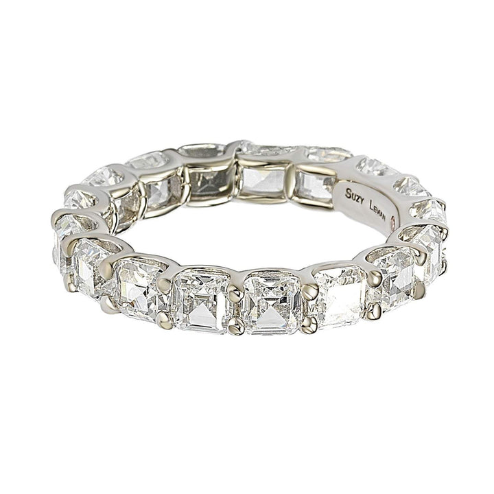 This Sterling Silver Cubic Zirconia White Modern Eternity Band by Suzy Levian features rich, asscher-cut cubic zirconia prong-set between two rows of white pave cubic zirconia. The high-polish sterling silver band adds to the ring's brilliance, making it a timeless piece perfect for engagements, anniversaries, or as a wedding band. The hidden fancy brown diamond (0.02 ct) in the shank adds a personal touch of empowerment and inner beauty.