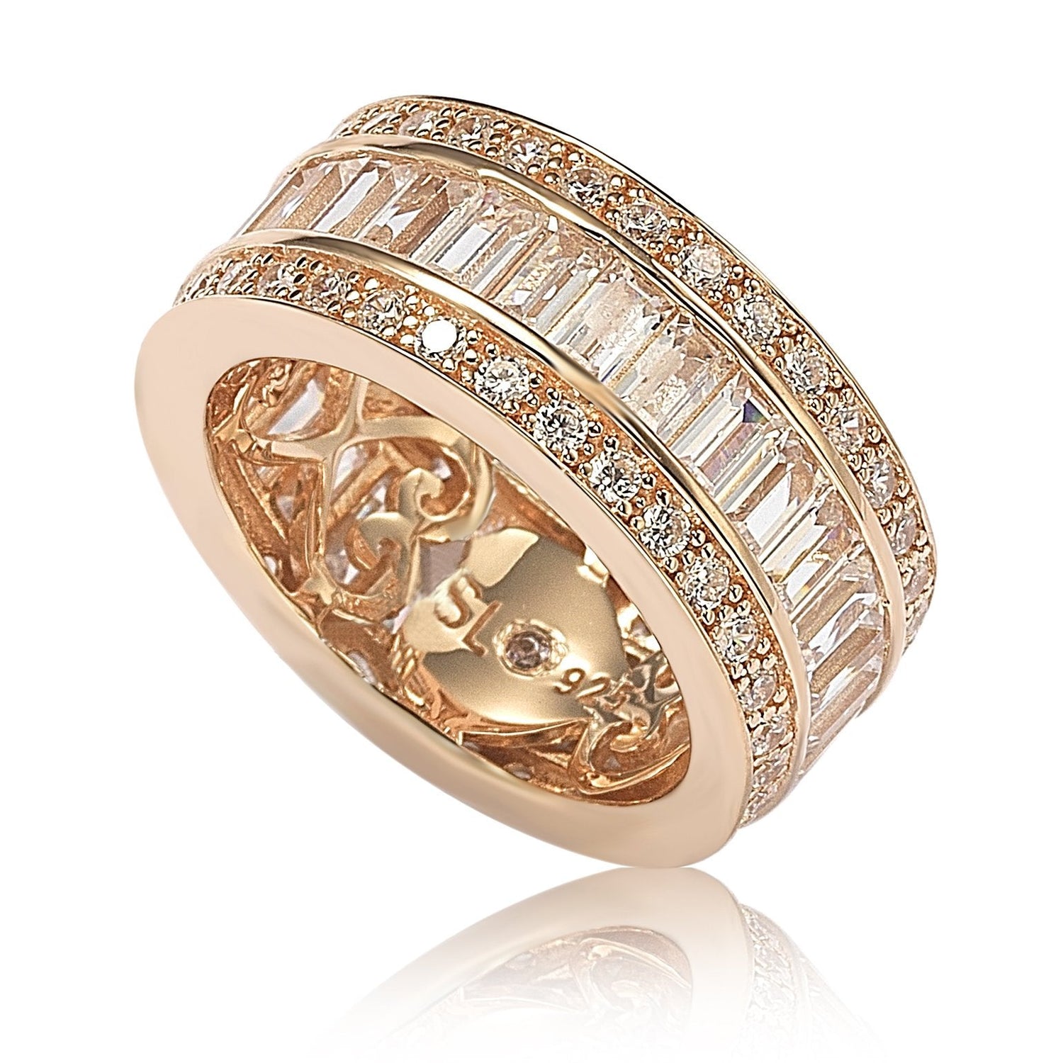 This Rose Sterling Silver Cubic Zirconia White Baguette Modern Eternity Band by Suzy Levian features white pave cubic zirconia set between two rows of channel-set white baguette cubic zirconia. Hand-set in rose-plated sterling silver, this ring symbolizes eternal love and strength. The hidden gemstone in the shank represents empowerment, while the elegant design ensures this ring remains a cherished symbol of commitment.