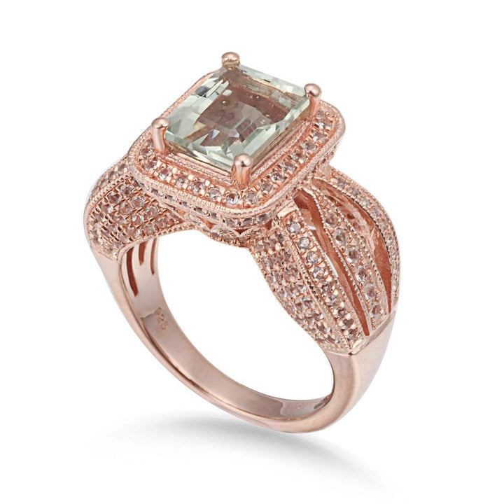 This Sterling Silver 4.6 cttw Green Amethyst Ring by Suzy Levian features a striking emerald-cut green amethyst center stone surrounded by 252 round-cut white topaz gemstones in a halo design. The high-polish sterling silver band enhances the brilliance of the gemstones, making this ring a stunning statement piece. Designed with a hidden white topaz gemstone in the shank, this ring symbolizes empowerment and inner beauty.