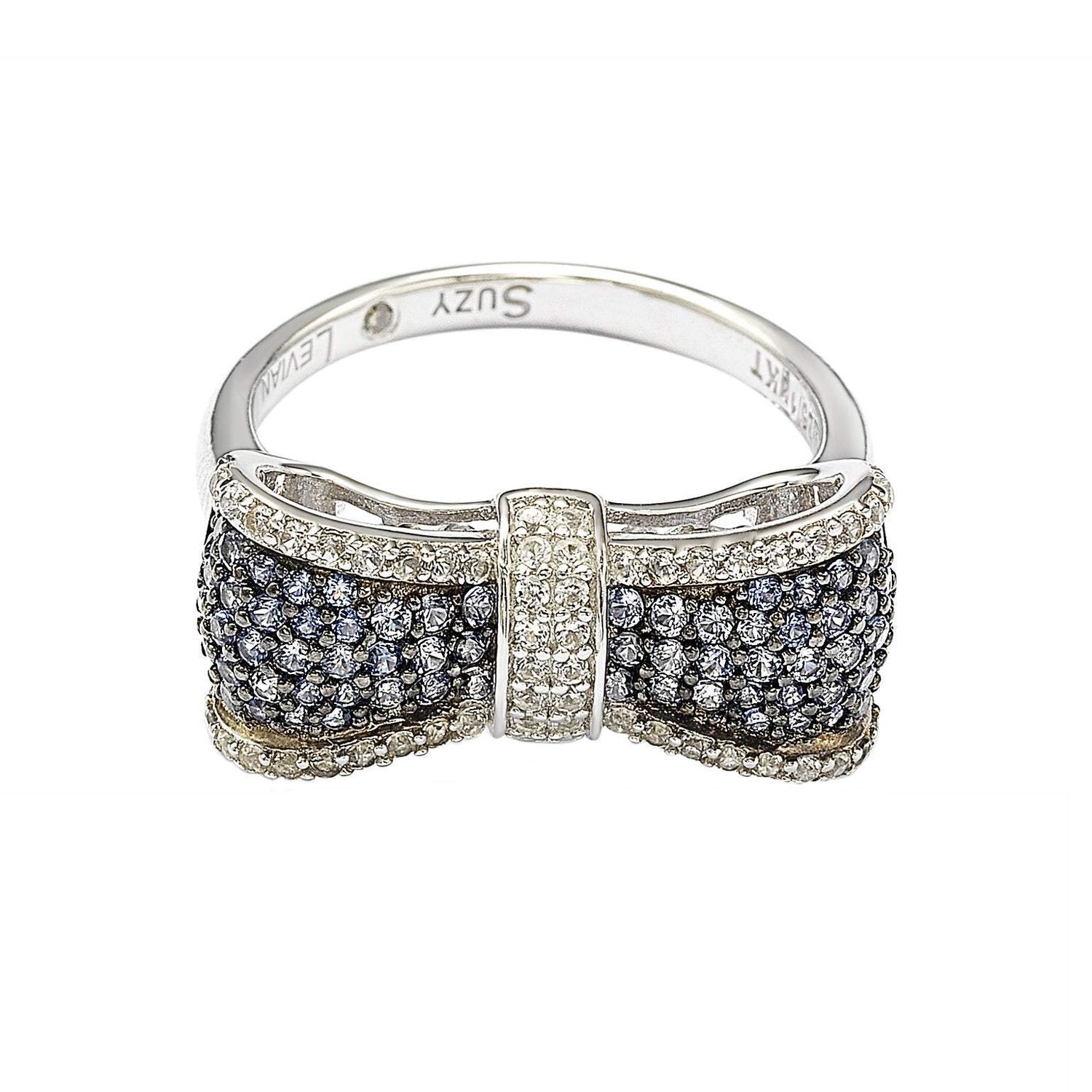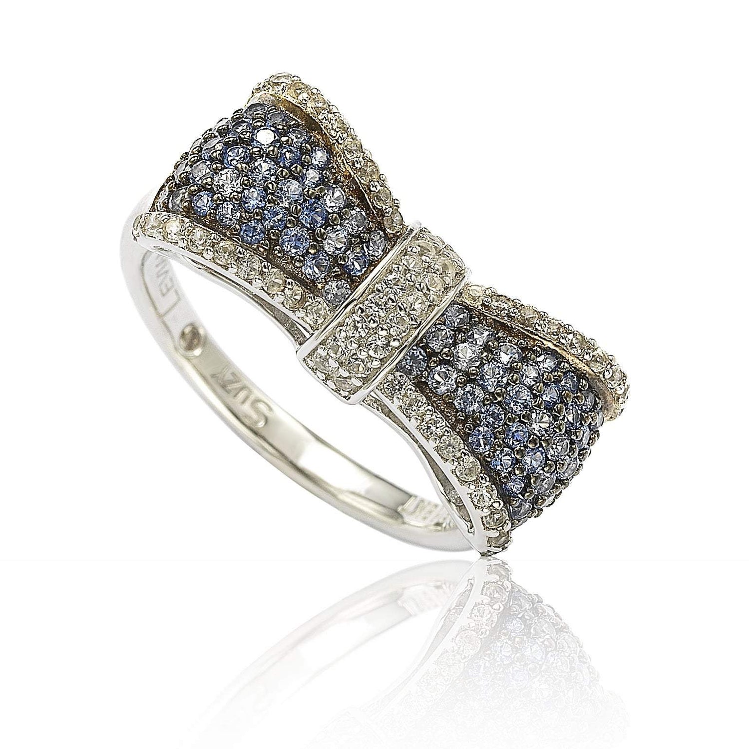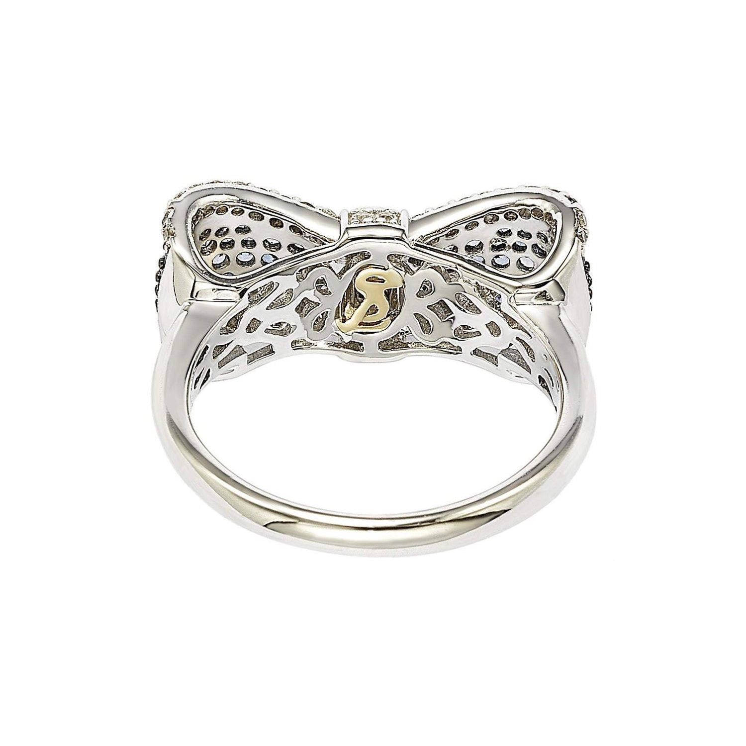 This Sterling Silver Blue & White Sapphire & Diamond Accent Bow Ring by Suzy Levian is a stunning piece that features a shimmering blue sapphire pave-set bow, surrounded by white sapphires. The band is designed with ribbons of blue and white sapphires, creating a sparkling, intricate design. The hidden brown diamond in the shank reinforces Suzy Levian’s message of empowerment.