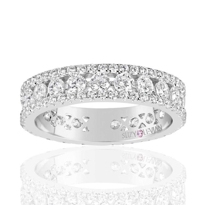 This Sterling Silver Cubic Zirconia White Three Row Modern Eternity Band by Suzy Levian is an eye-catching piece that features large round-cut white pave cubic zirconia bar-set between two rows of smaller round-cut white cubic zirconia. This luxurious anniversary ring is perfect for symbolizing everlasting love. The closed under-gallery ensures comfort, while the hidden gemstone inside the shank signifies empowerment.