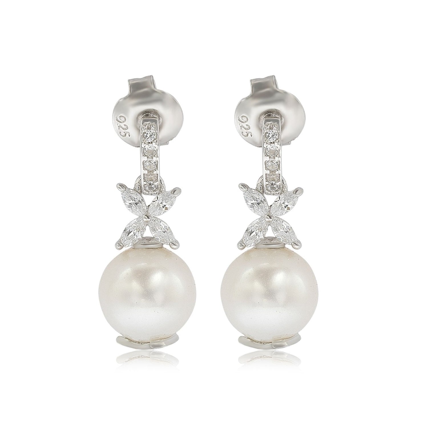 These Sterling Silver Pearl & White Sapphire Floral Earrings by Suzy Levian are inspired by nature, featuring 8mm white cultured freshwater pearls and 4 marquise-cut created white sapphires arranged in a flower design. The earrings sway with movement, adding elegance and sparkle to any outfit. The hidden SL logo symbolizes the beauty that comes from within.