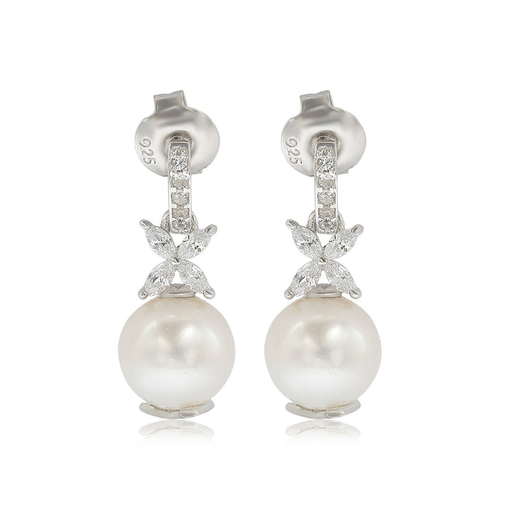 Handcrafted in sterling silver with 8mm white cultured freshwater pearls and 4 marquise-cut created white sapphires. Earring dimensions: 25 mm long x 15 mm wide. High-polish finish with a hidden SL logo at the bottom of each earring.