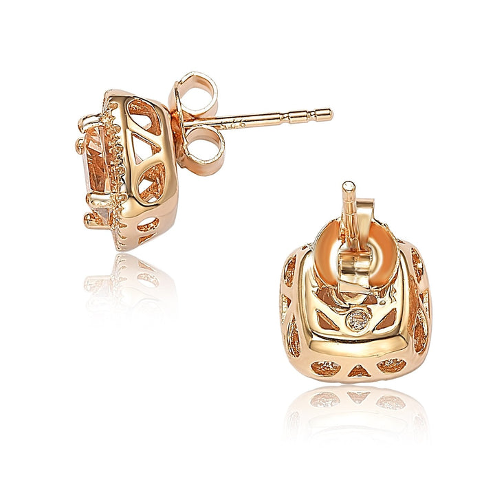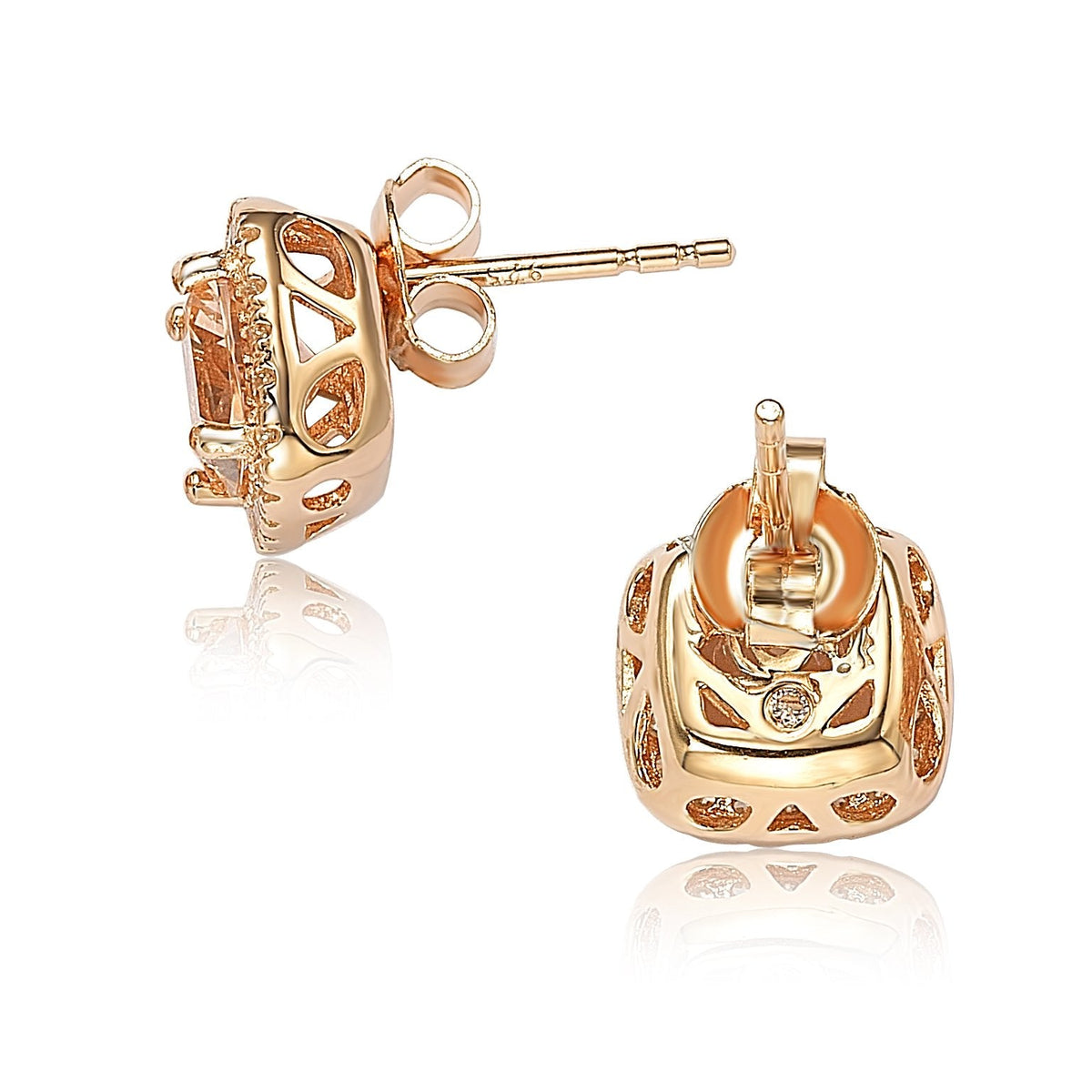 These Suzy Levian Rose Sterling Silver Cushion Cut Morganite Cubic Zirconia Halo Studs feature cushion-cut morganite cubic zirconia surrounded by a halo of white cubic zirconia, set in a rose-plated sterling silver setting. Finished with the SL logo in the back to symbolize inner beauty.