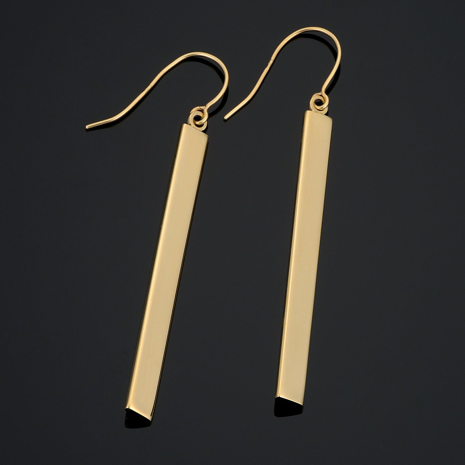 Made of fine 14k solid yellow gold. Earrings measure 4mm wide x 41mm long. High polish finish. Fishhook closure.