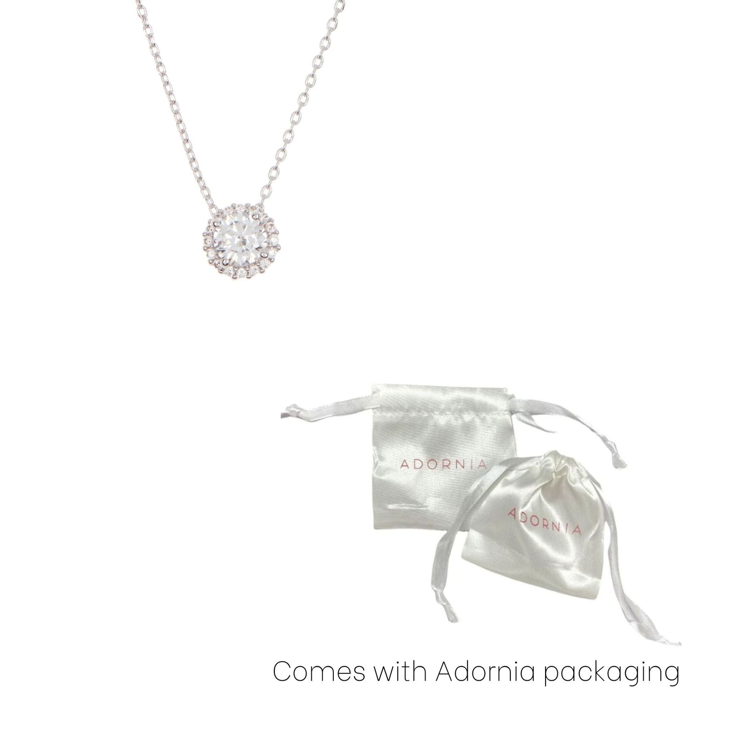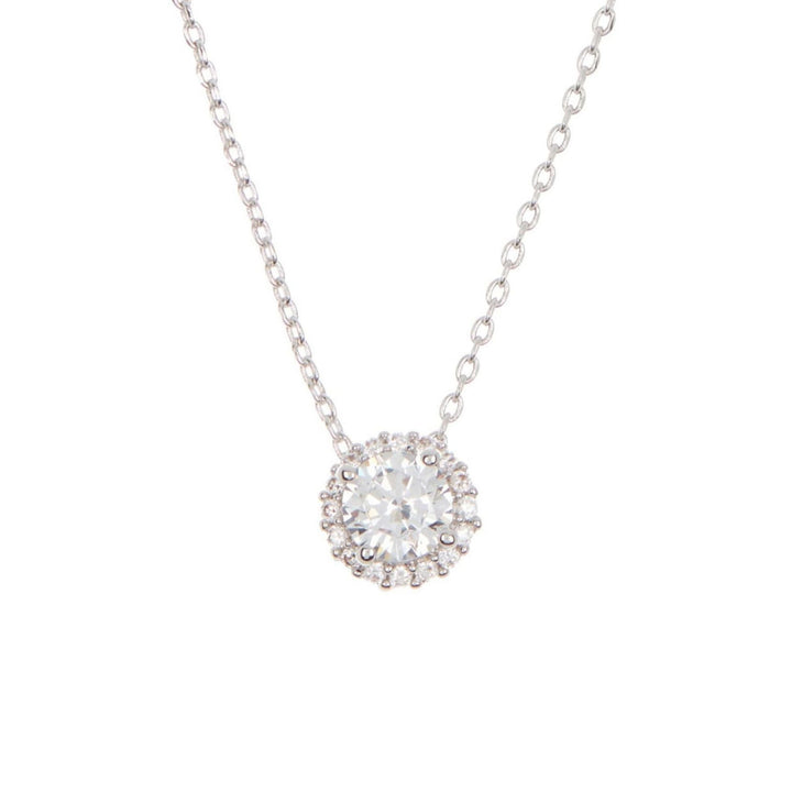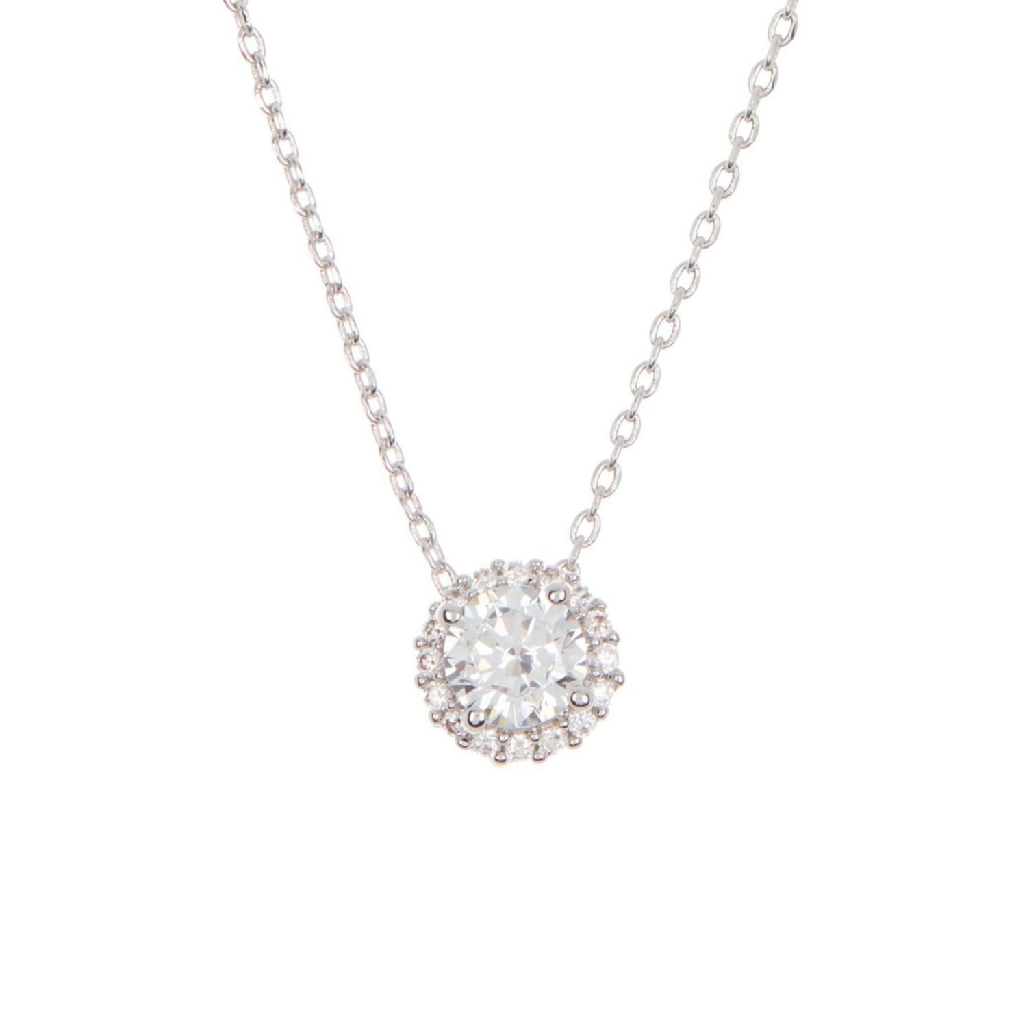 This Adornia Swarovski Crystal Halo Necklace in Silver is a simple yet elegant piece featuring a Swarovski crystal stone surrounded by a delicate halo design. The white rhodium over brass ensures a brilliant shine, making this necklace a perfect accessory for any occasion.