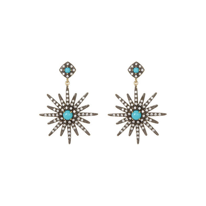 These Adornia Starburst Earrings in Silver feature a striking starburst design, with crystals and turquoise resin detailing. The earrings are lightweight and easy to wear, making them a perfect statement piece. With black rhodium and 14k gold plated brass finishes, these earrings are elegant and bold.