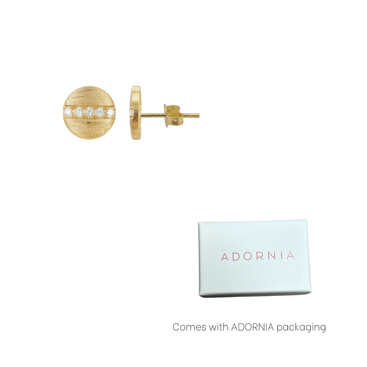 These Adornia Pave Line Disc Studs in Gold feature a sleek, modern disc design with pave crystals for a touch of glamour. The 9mm diameter discs are plated with 14k yellow gold, creating a refined look that’s perfect for any occasion.
