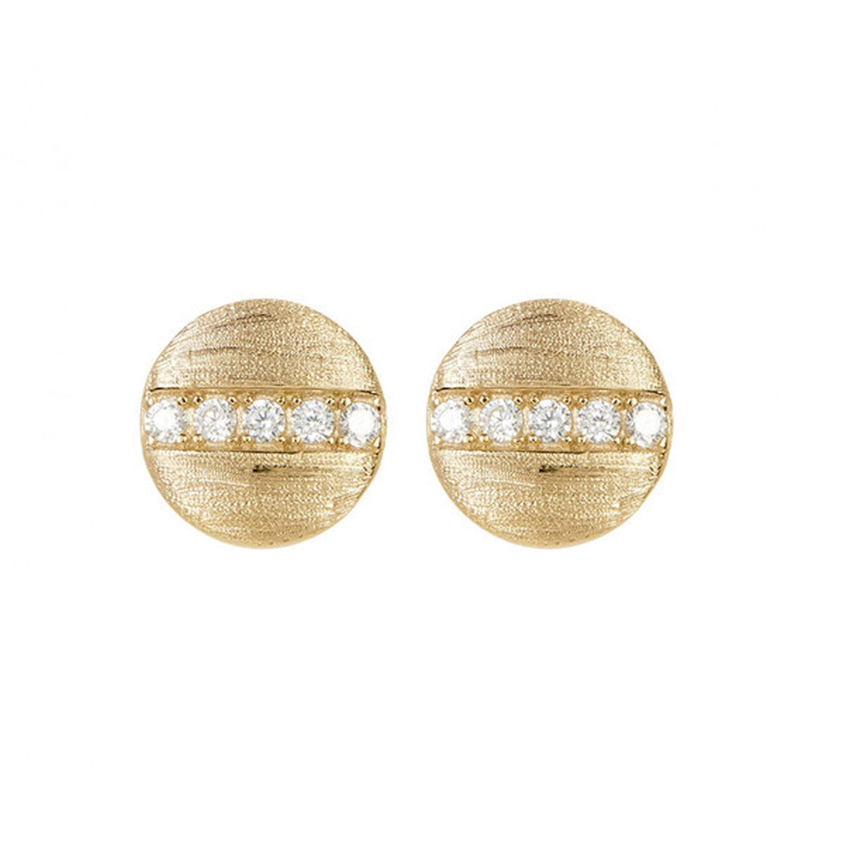 14k yellow gold plated brass. Pave line disc design. Earrings size: 9mm diameter. Post earrings require pierced ears.