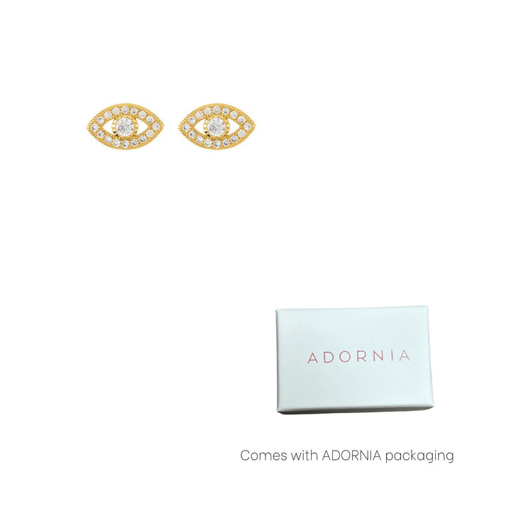 These Adornia Crystal Evil Eye Studs are a modern take on a classic protective symbol. The silver evil eye design is embellished with crystals, bringing a touch of sparkle to this meaningful piece. With a delicate 14k yellow gold plating, these studs offer both elegance and symbolism. Perfect for adding a touch of protection to your daily style.