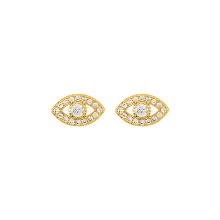 Handcrafted in 14k yellow gold-plated brass. Features silver evil eye design with crystal embellishment. 0.5' wide x 0.35' tall. Post stud with pierced ear requirement.