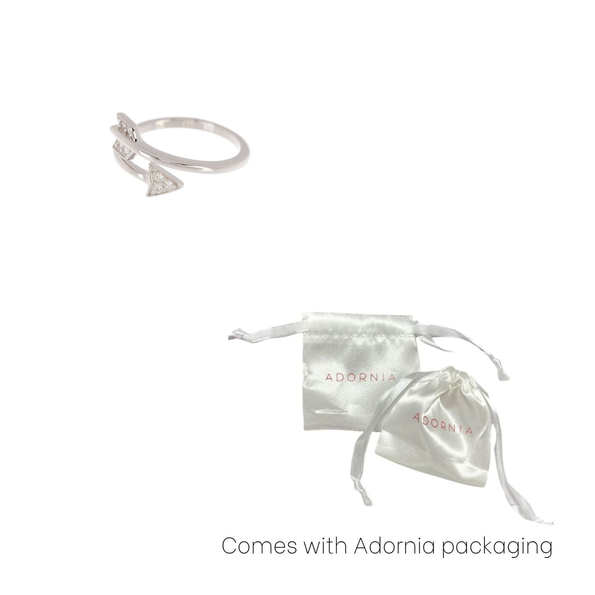 This Adornia Open Arrow Ring features a simple yet bold arrow design, accented with Swarovski crystals. The white rhodium plating enhances the sleek, modern look, while the adjustable band ensures a perfect fit. This ring makes a striking statement, symbolizing direction and movement with a touch of elegance.