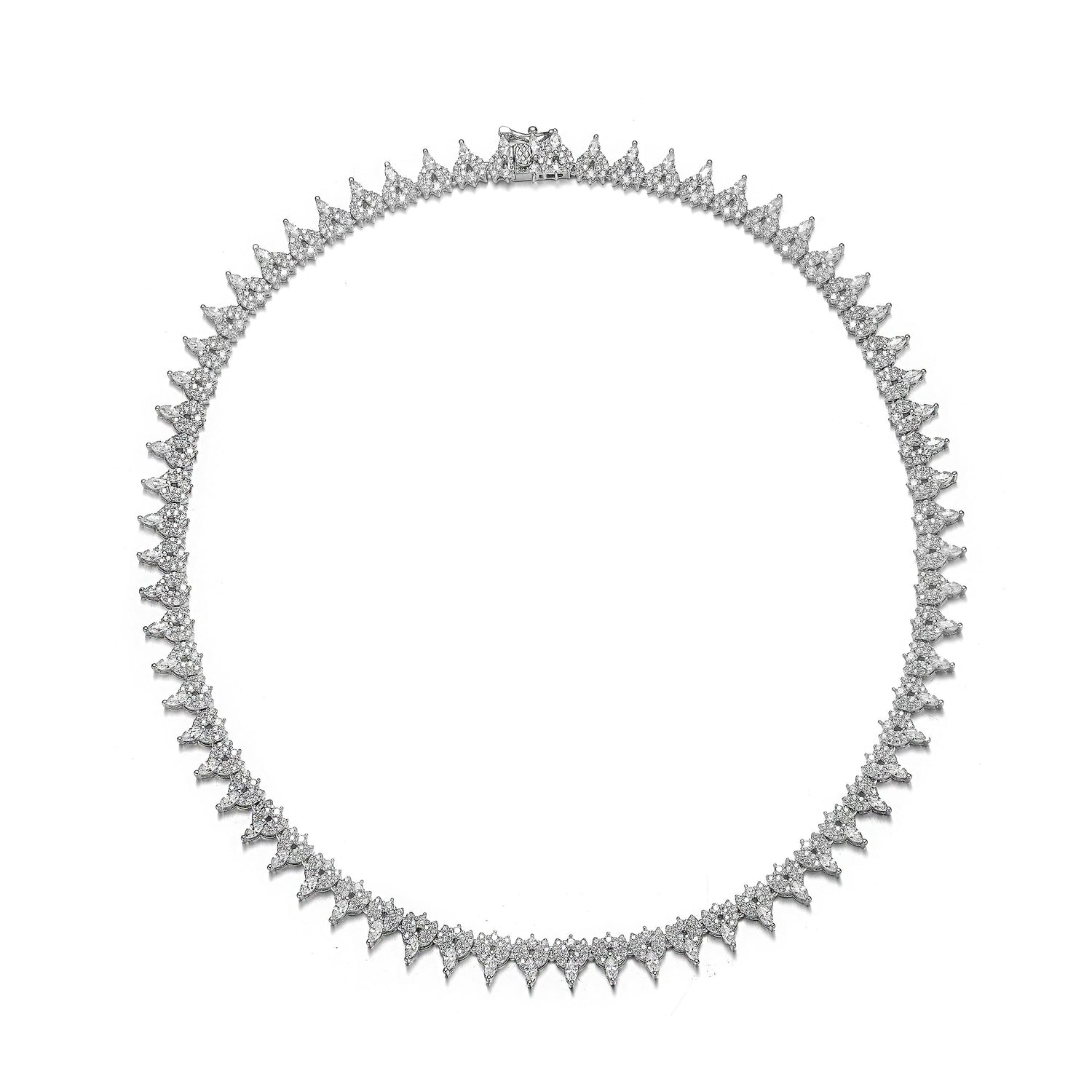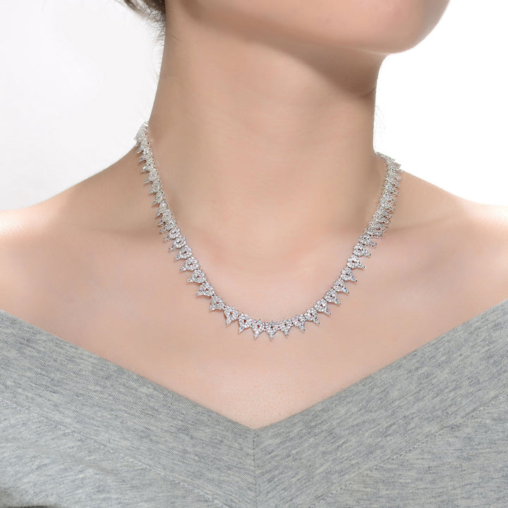 Sterling Silver Clear Cubic Zirconia Cluster Tennis Necklace by Genevive is a unique and eye-catching take on the classic tennis necklace. Designed with round and marquise cubic zirconia stones, each cluster forms an intricate jet plane-inspired trinket that makes a bold statement. This beautifully assembled design radiates modern elegance, making it a perfect choice for special occasions.