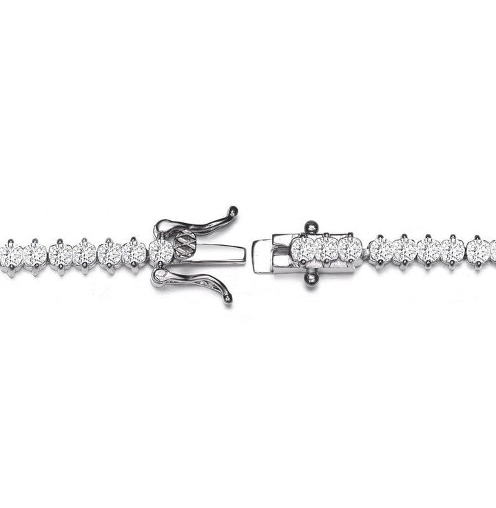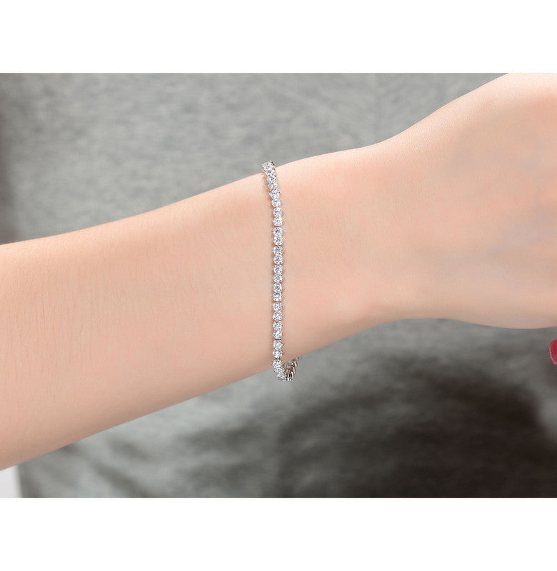 Crafted in sterling silver with white gold plating, featuring clear round cubic zirconia stones. Length: 7 inches. Secured with a box clasp.