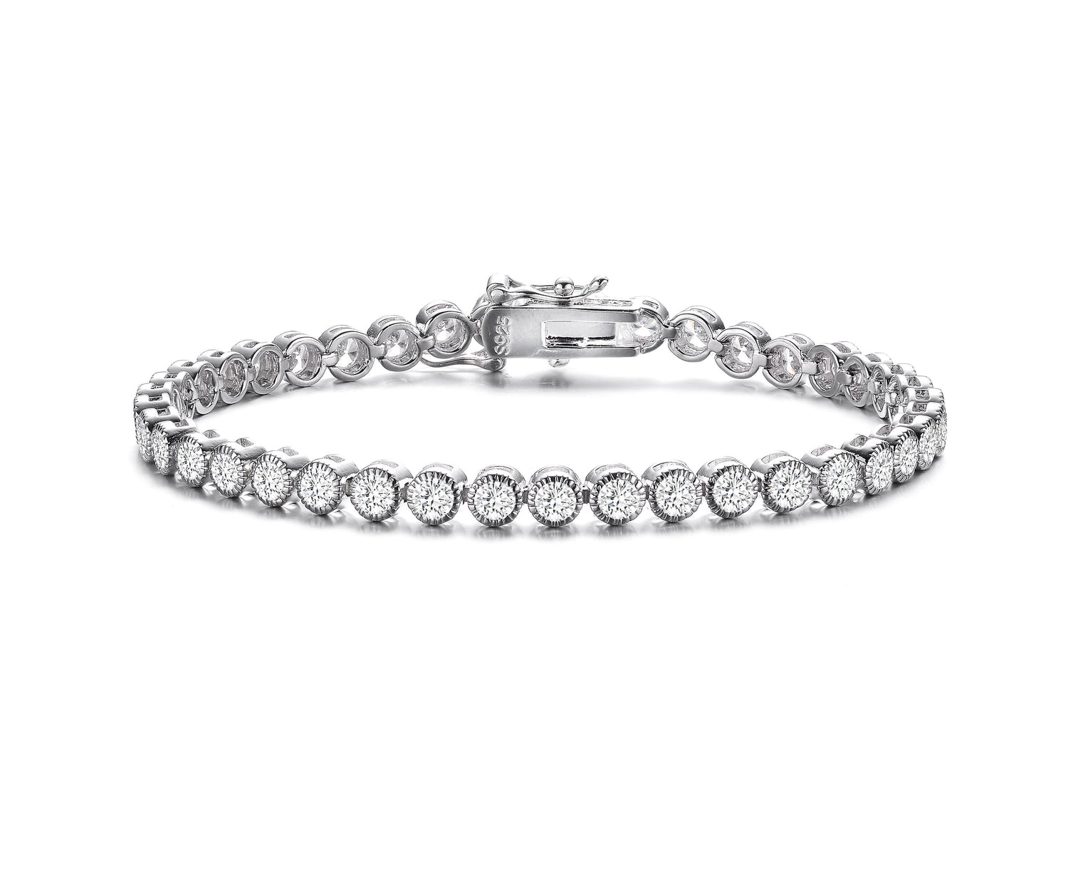 Crafted in sterling silver with rhodium plating, featuring clear round cubic zirconia stones in a milgrain bezel setting. Secured with a box clasp.