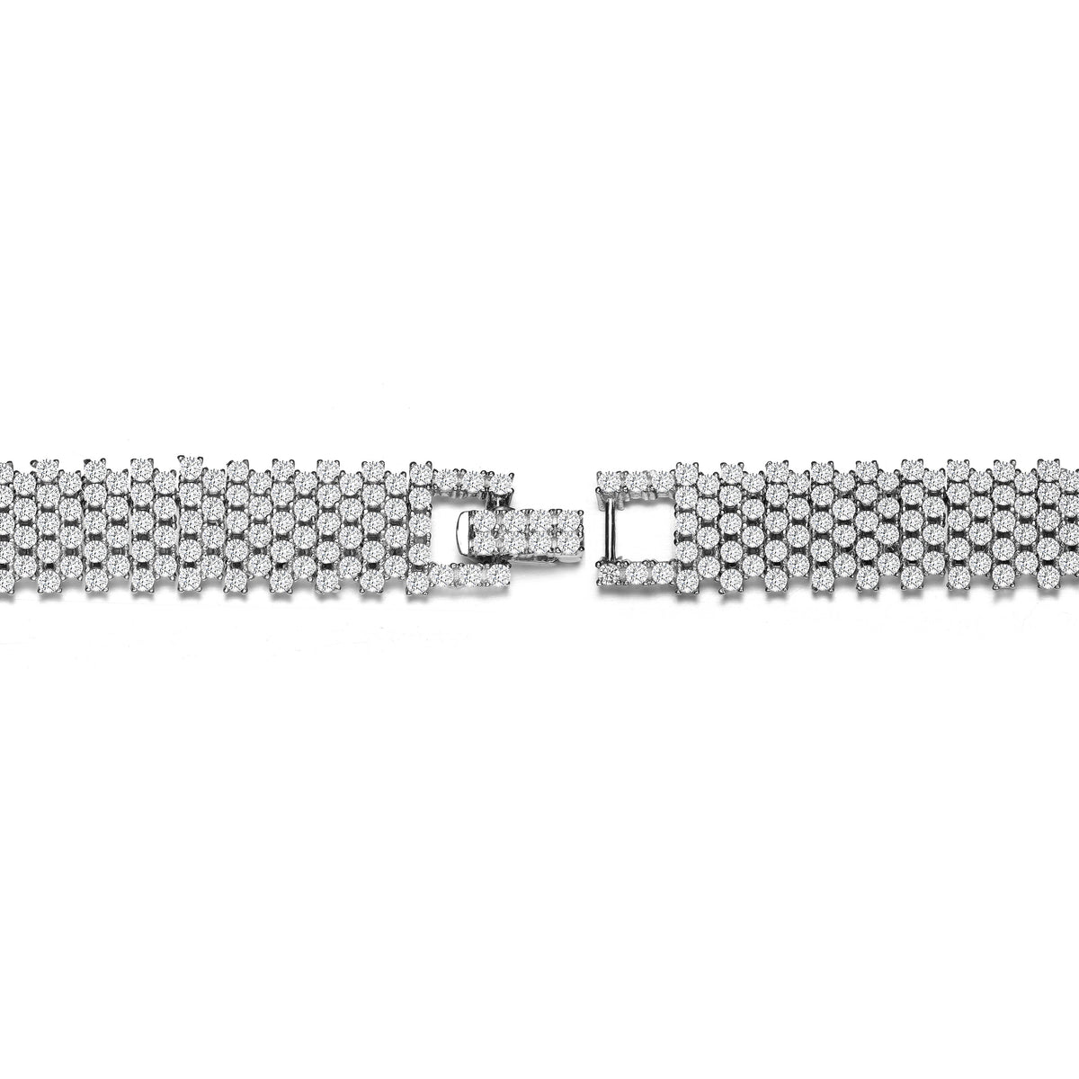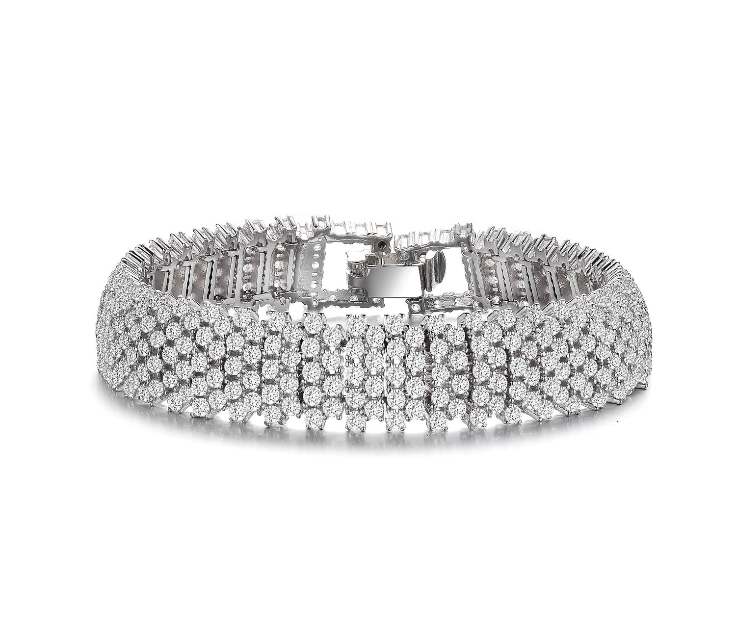 Crafted in sterling silver with rhodium plating, featuring pavé-set clear round cubic zirconia stones in a linear link pattern. Secured with a fold-over closure.