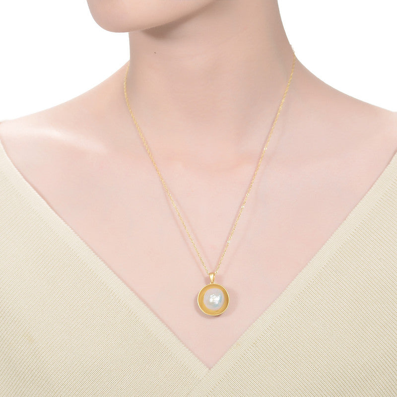 Crafted in sterling silver with 14k gold plating, featuring a round freshwater pearl set in a round metal frame. Pendant size: 26.4mm. Chain length: 16" + 2" extender. Secured with a spring ring clasp.