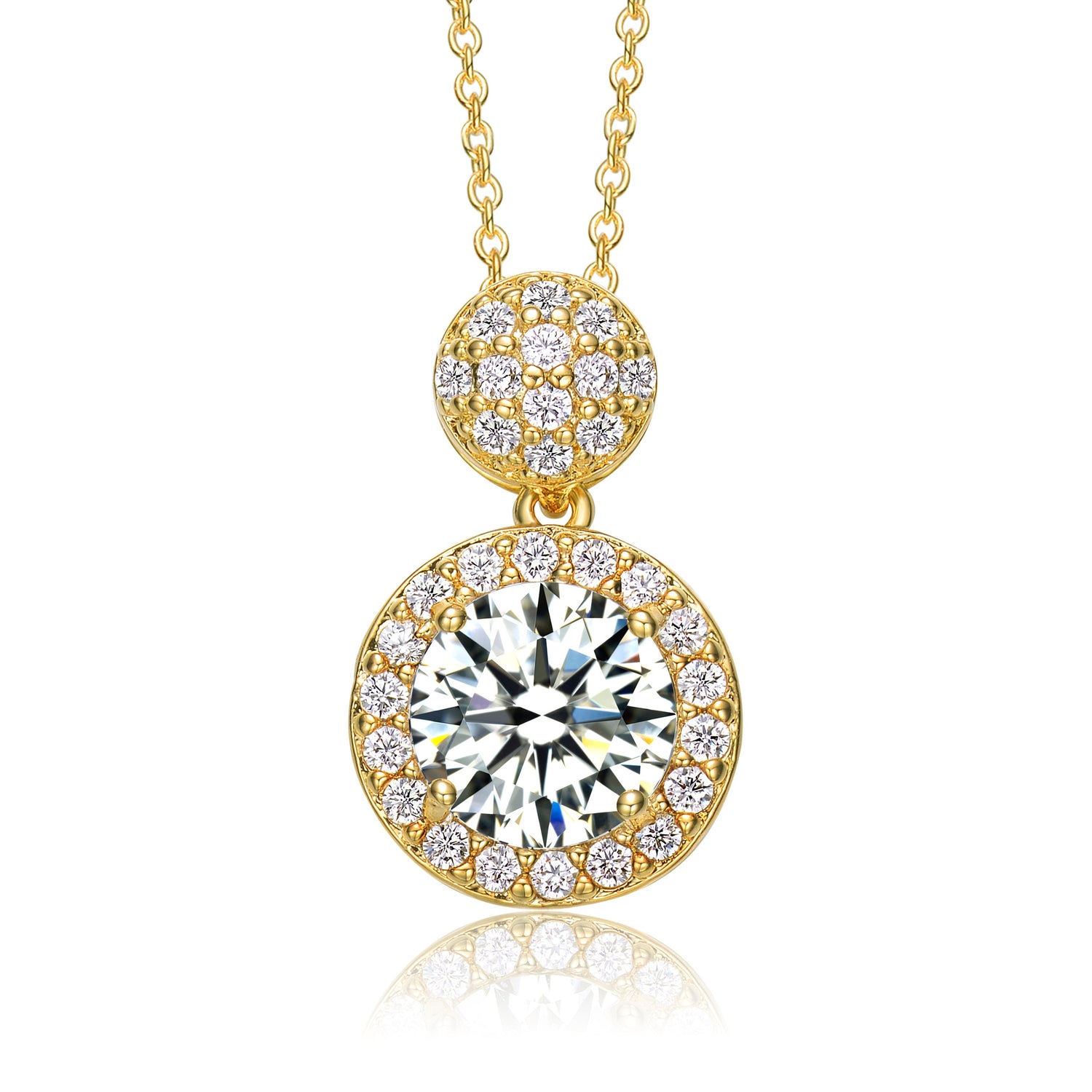 Sterling Silver Gold Plated Cubic Zirconia Halo Cluster Necklace by Genevive dazzles with radiant brilliance. Two interlocking gold-plated circles are adorned with clear round cubic zirconia stones—one with a pavé design and the other featuring a halo of sparkling stones encircling a larger central gem. A sophisticated pendant that adds an elegant touch to any occasion.
