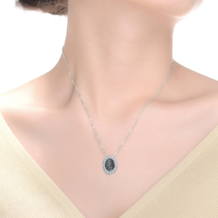 Crafted in sterling silver with black and clear cubic zirconia stones. The pendant features an oval-cut black cubic zirconia, accented with a halo of clear cubic zirconia for a dazzling effect. Suspended from a delicate chain with a spring ring closure.