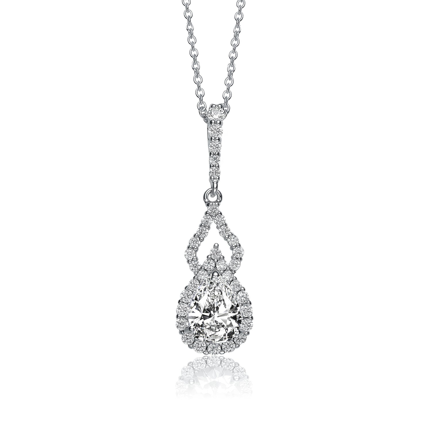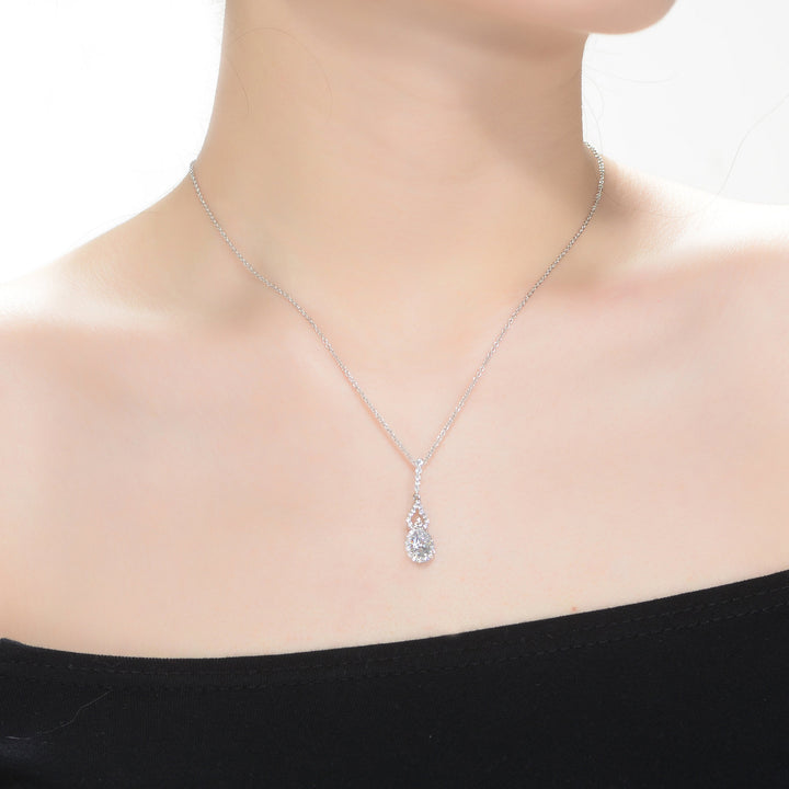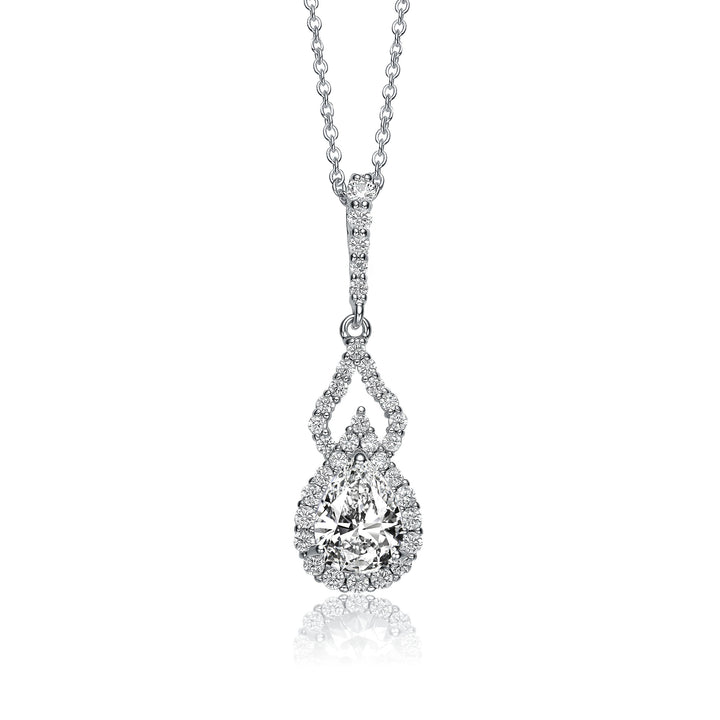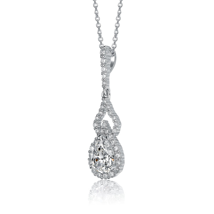 Crafted in sterling silver with rhodium plating. Features a pear-cut cubic zirconia with a halo of round-cut stones, accented with an open pear-shaped cubic zirconia frame. The pendant hangs from a delicate chain with a spring ring closure.