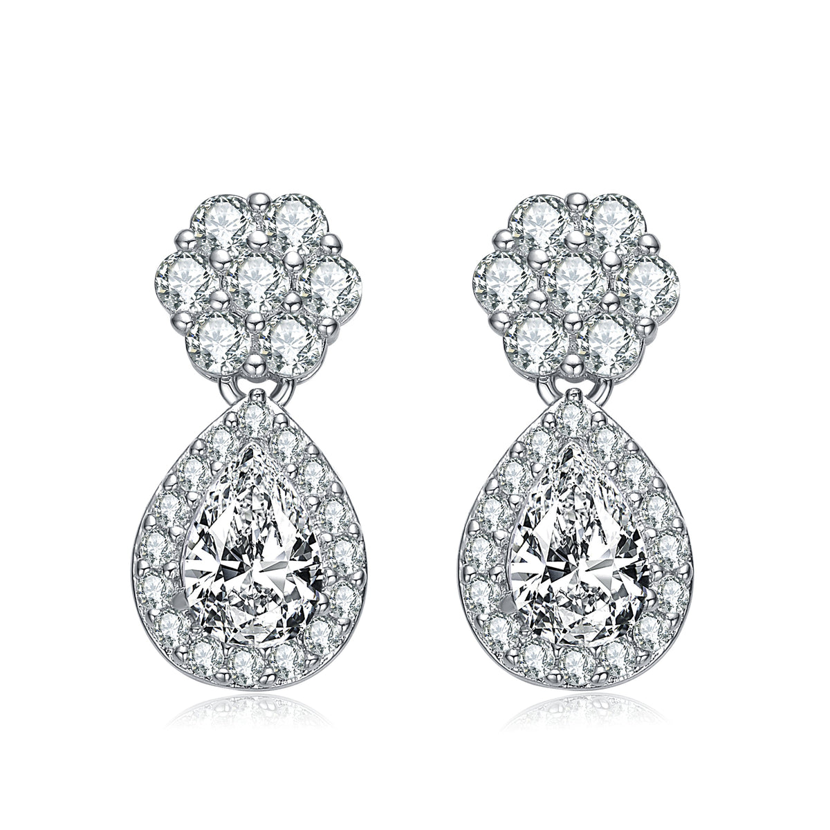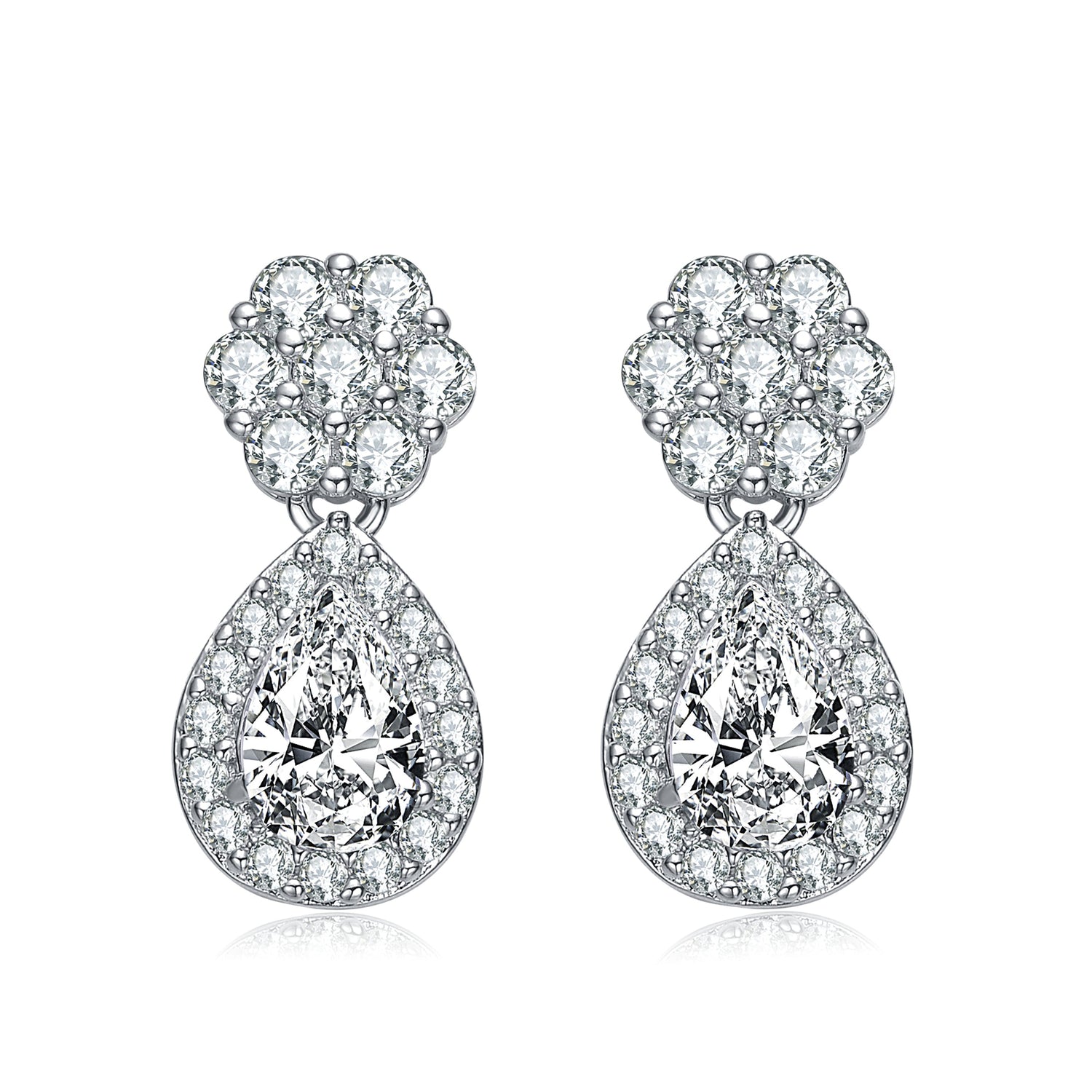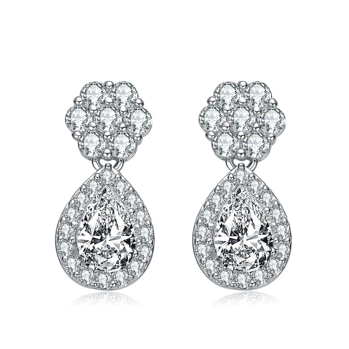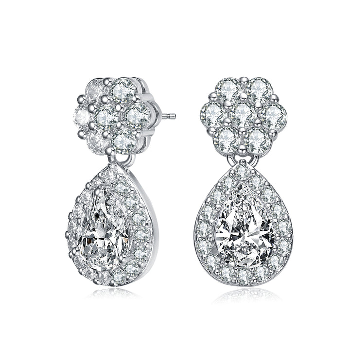 Crafted in sterling silver with rhodium plating. Features a pear-cut cubic zirconia drop with a halo of round-cut stones, accented by a flower-shaped cubic zirconia cluster post. Secured with a butterfly clasp.