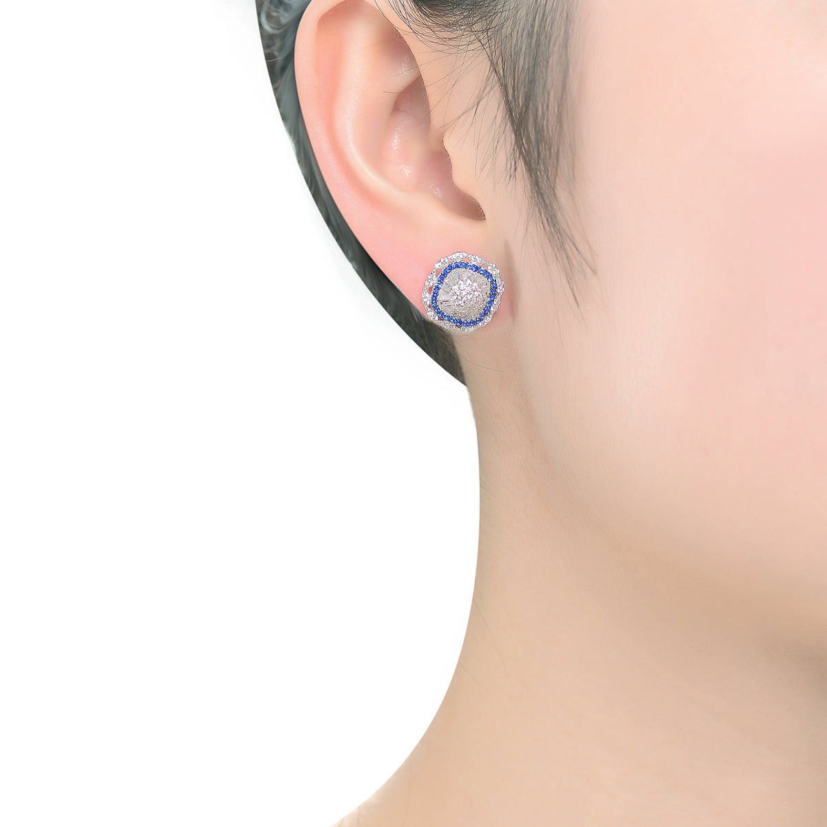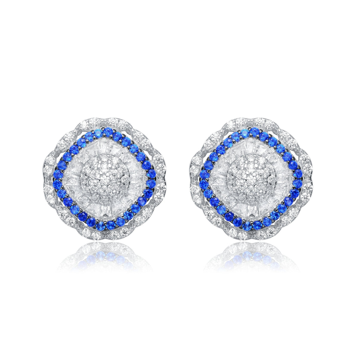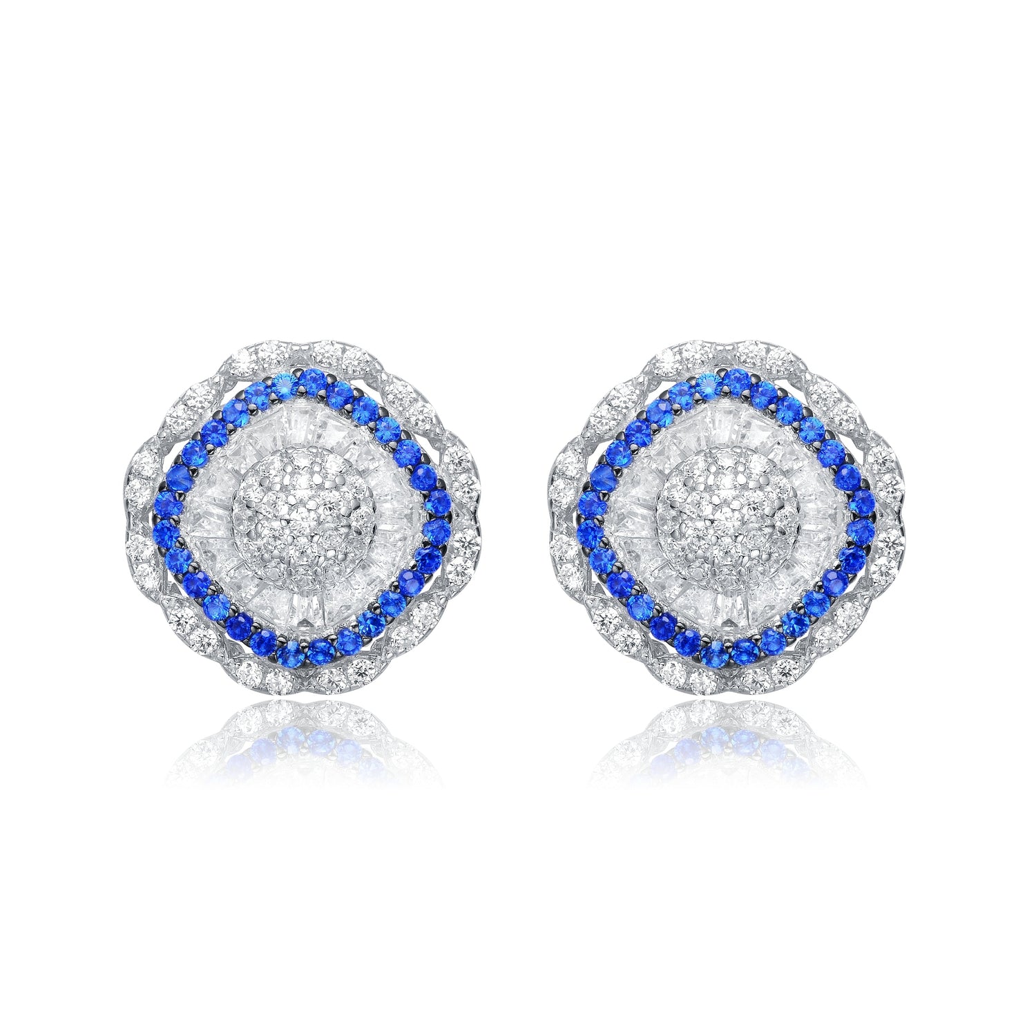 Crafted in sterling silver with rhodium plating. Features a clear round cubic zirconia center, surrounded by baguette and round blue cubic zirconia, with an outer row of clear cubic zirconia. Secured with a post closure.