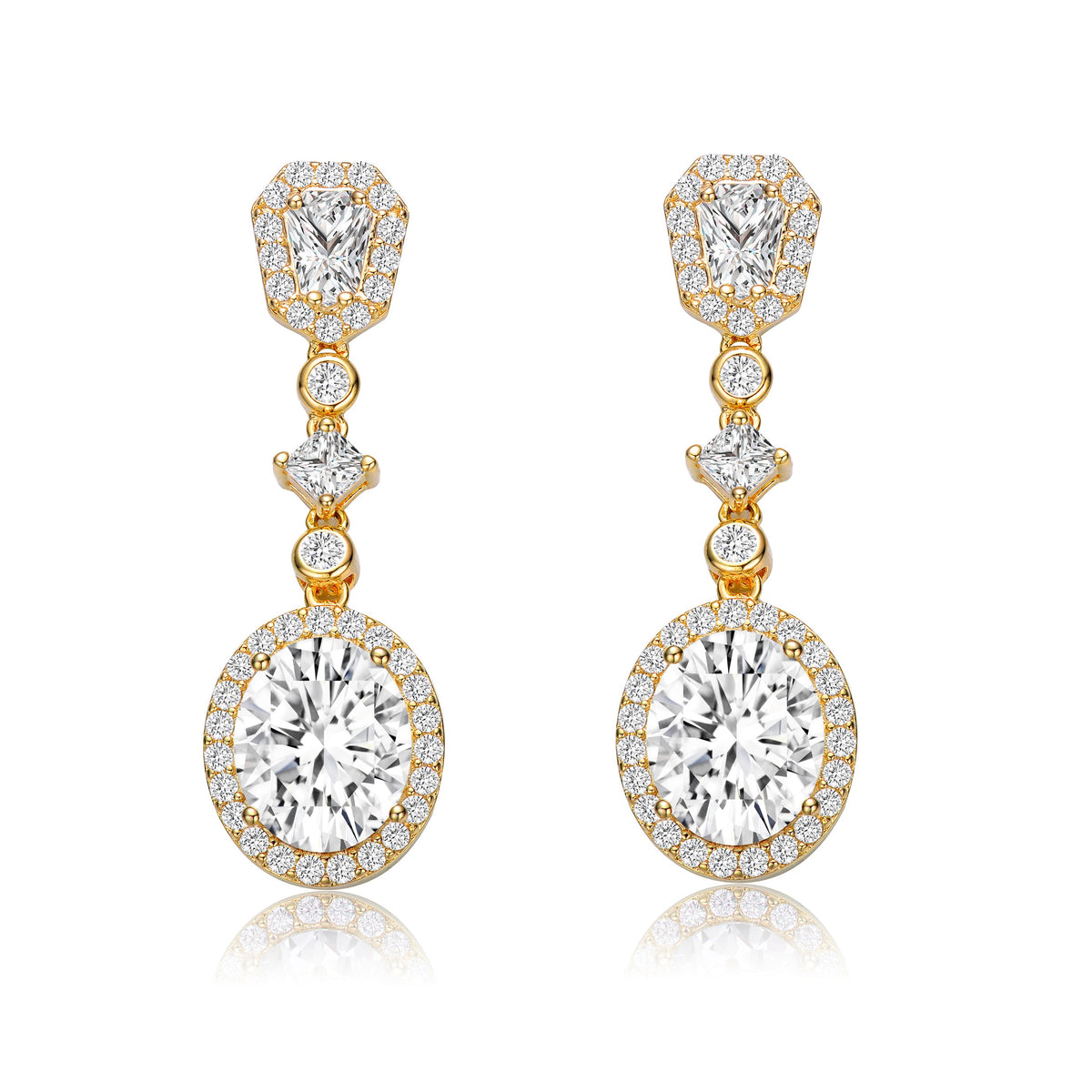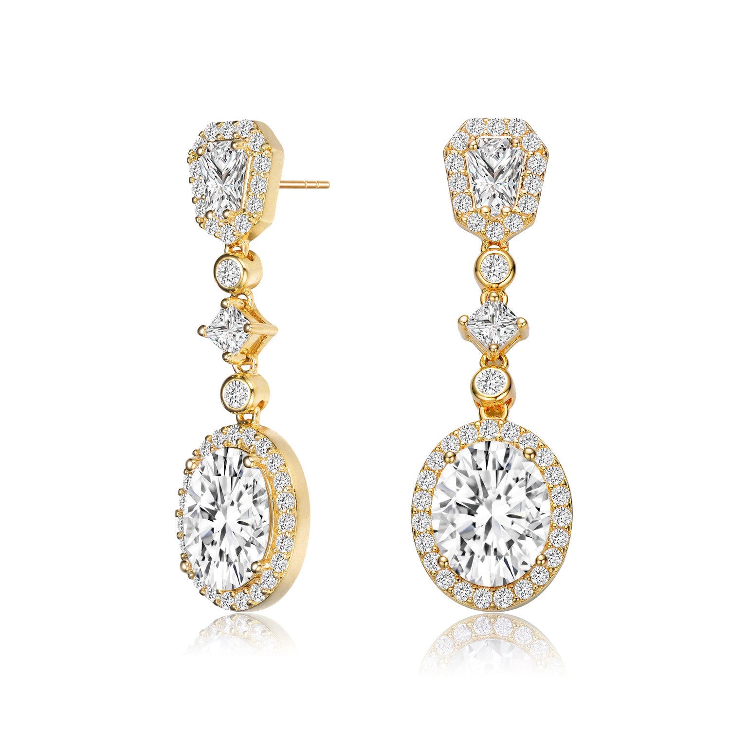 Crafted in sterling silver with gold plating. Features an oval-cut cubic zirconia drop encased in a halo of round stones, a trail of round and princess-cut cubic zirconia, and a haloed heptagon-cut cubic zirconia post. Secured with a butterfly clasp.