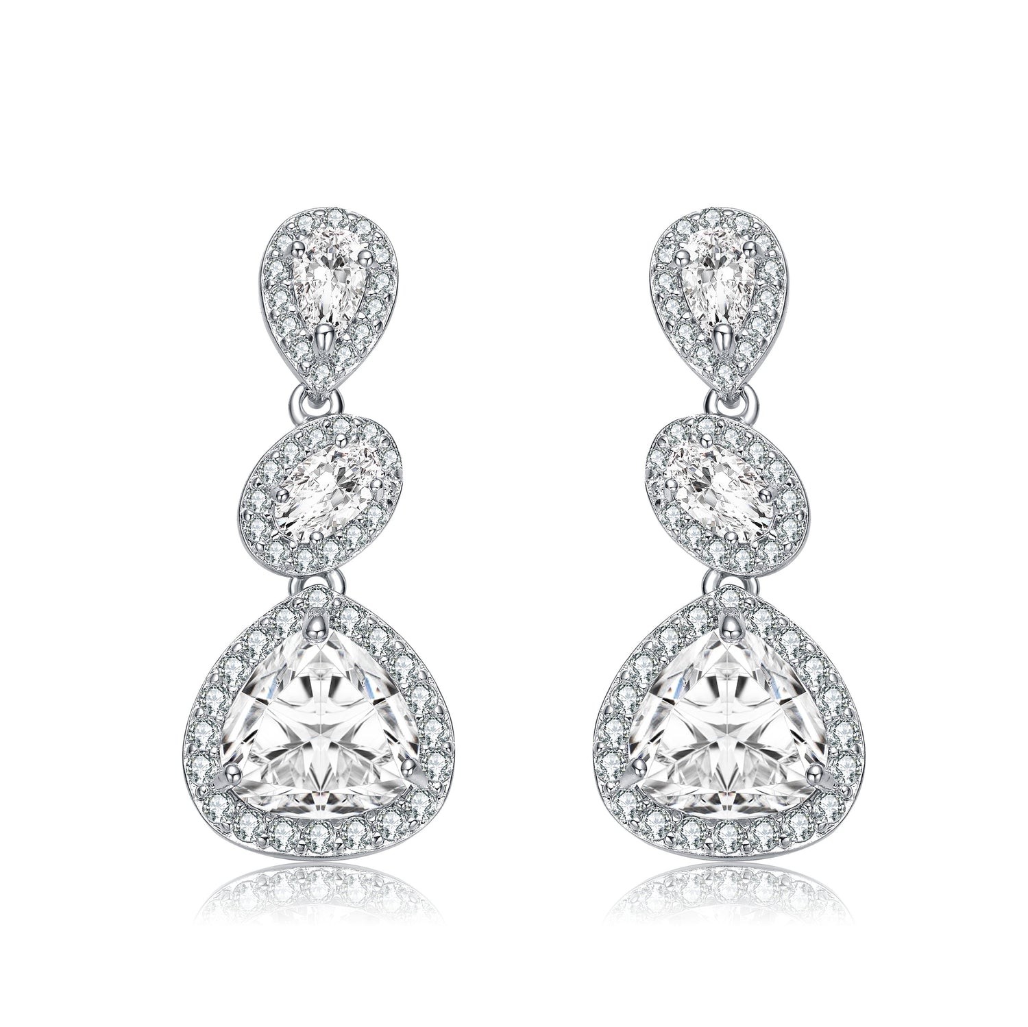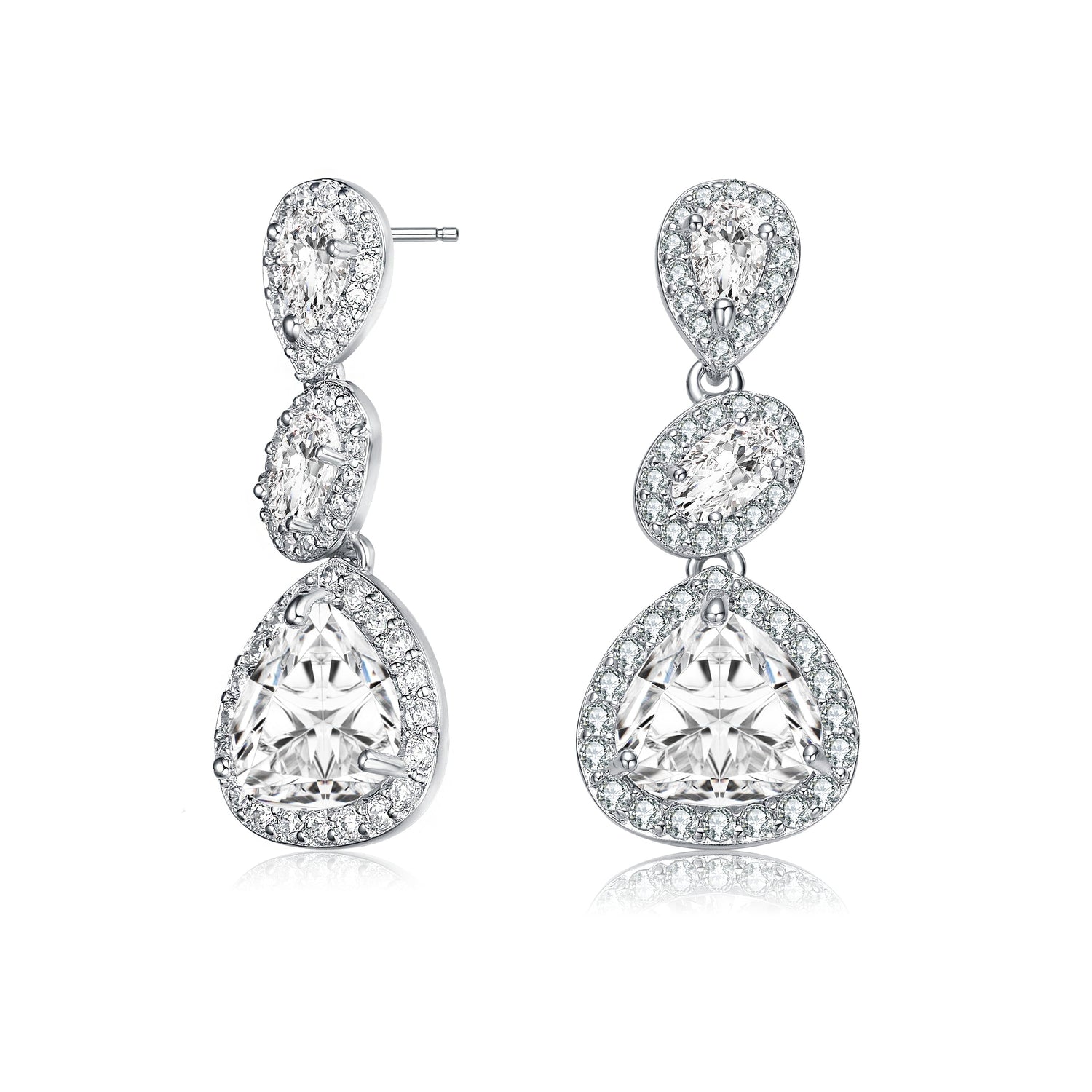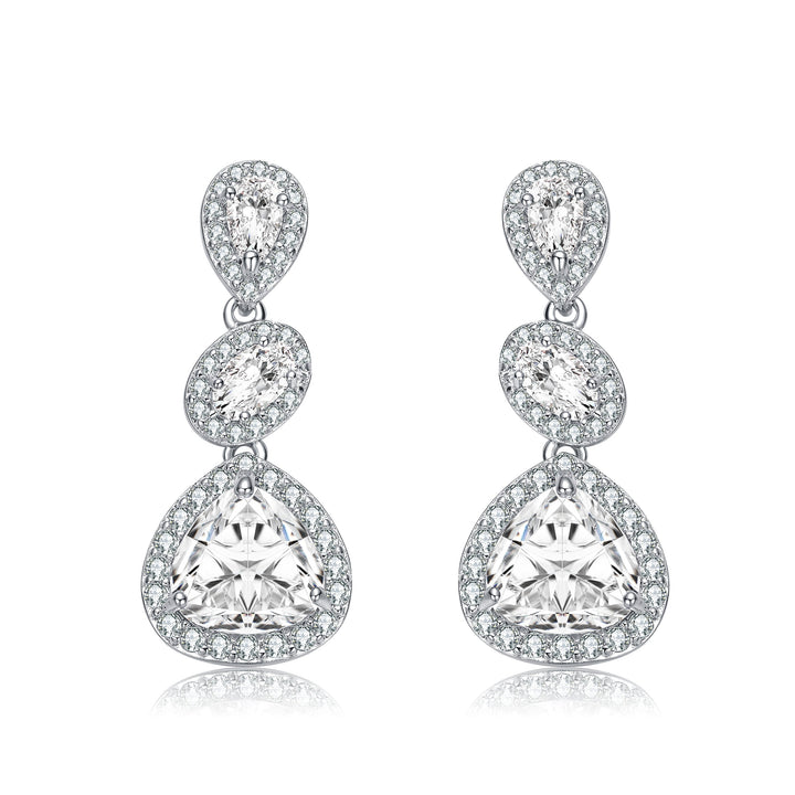 These Sterling Silver Cubic Zirconia Halo Three Tier Drop Earrings by Genevive radiate brilliance with their cascading design. Two pear-cut cubic zirconia drops and an oval-cut centerpiece are encased in halos of shimmering round stones, creating a luminous and elegant look. A striking choice to add sophisticated sparkle to evening attire.