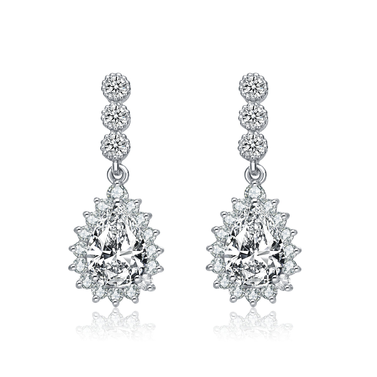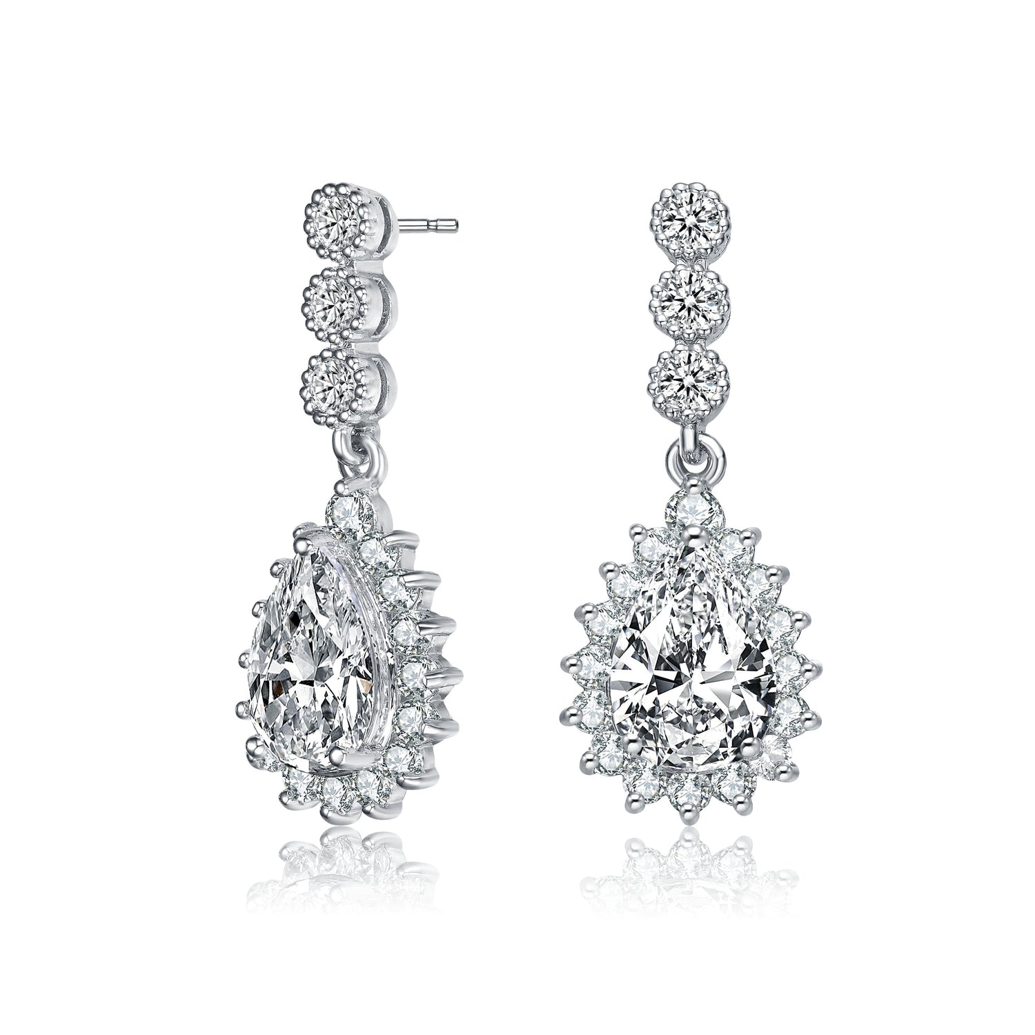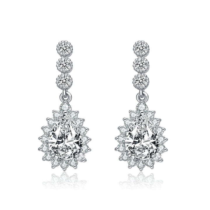 Crafted in sterling silver with rhodium plating. Features a pear-cut cubic zirconia encircled by a halo of round stones, connected by three round-cut cubic zirconia in a linear drop design. Secured with a butterfly clasp.