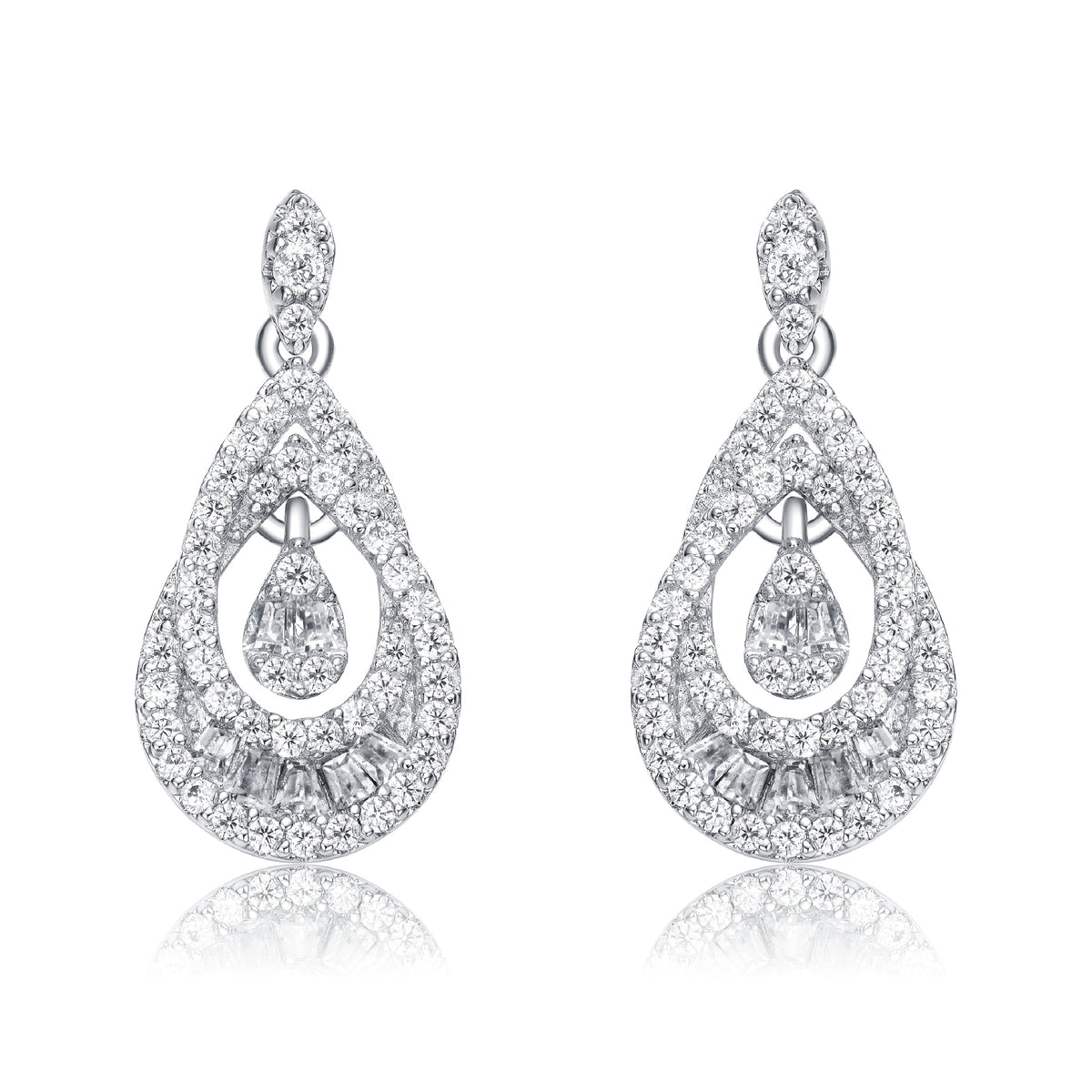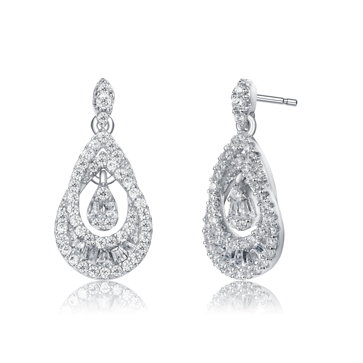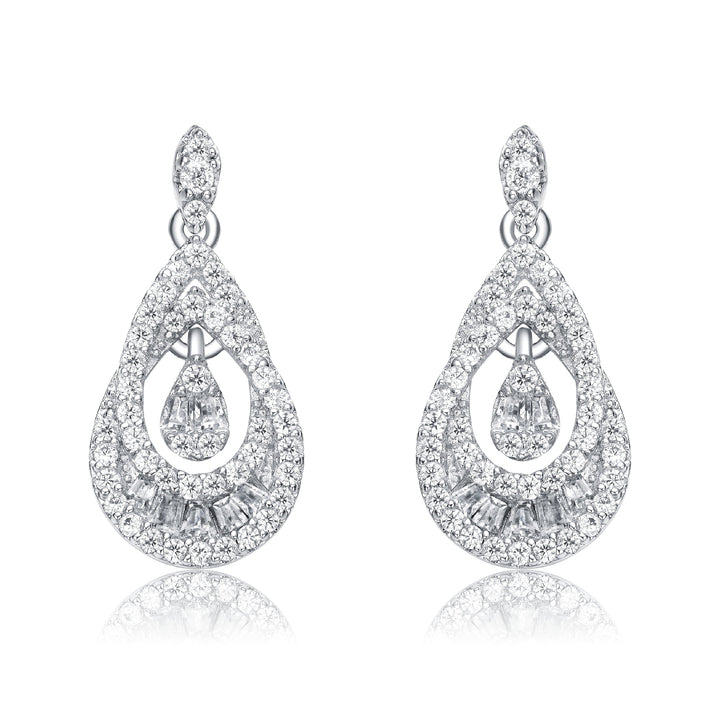 Crafted in sterling silver with rhodium plating. Features pear-shaped frames encrusted with baguette and round cubic zirconia, with a suspended inner frame set with additional baguette-cut stones. Secured with a butterfly clasp.
