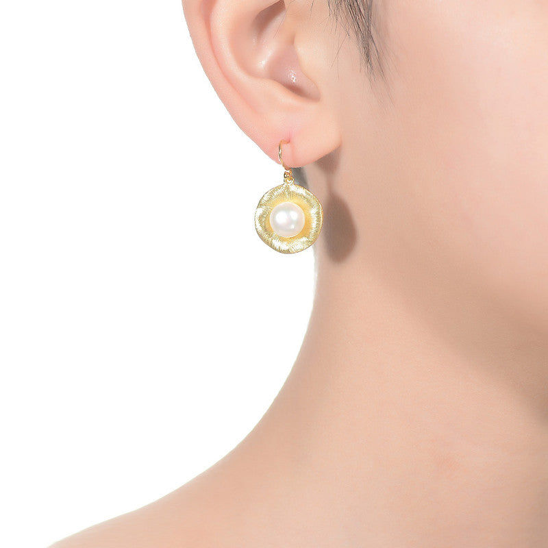 Crafted in sterling silver with 14k gold plating. Features a round freshwater pearl set within a curvy gold-plated metal frame. Earrings measure 35mm and secure with a hook clasp.