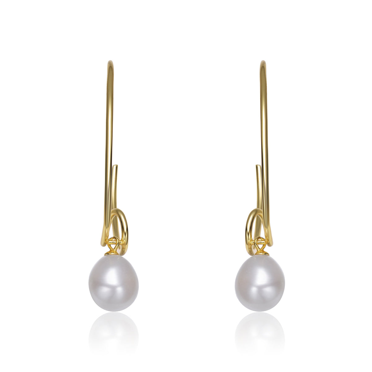 Crafted in sterling silver with gold plating. Features an open hoop design with a small freshwater pearl drop. Secured with a butterfly clasp.