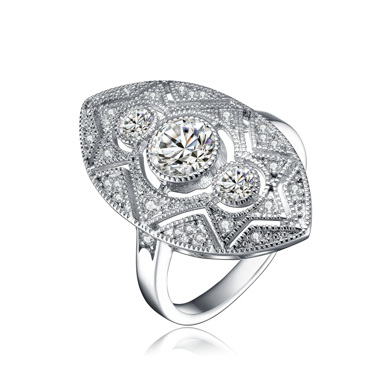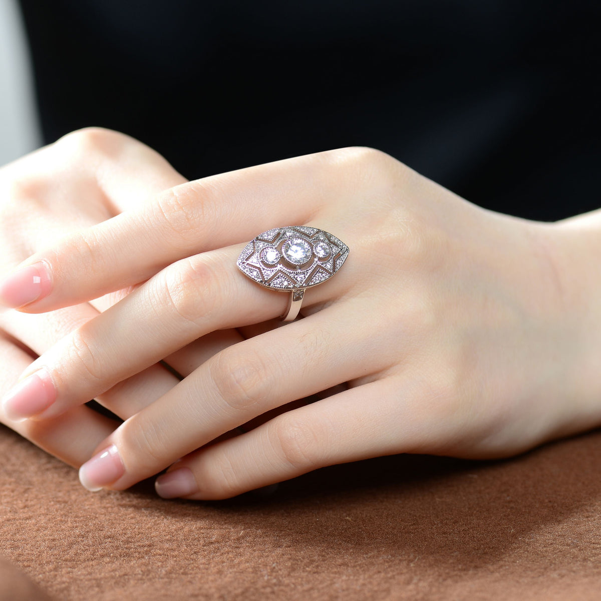 Crafted in sterling silver with white gold plating. Features a marquise-shaped filigree design, with angular details accented with clear round cubic zirconia and a three-stone graduated cubic zirconia centerpiece. Available in sizes 5, 6, 7, 8, 9, and 10.