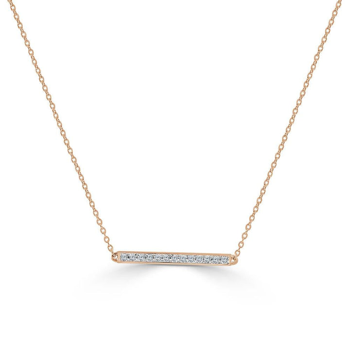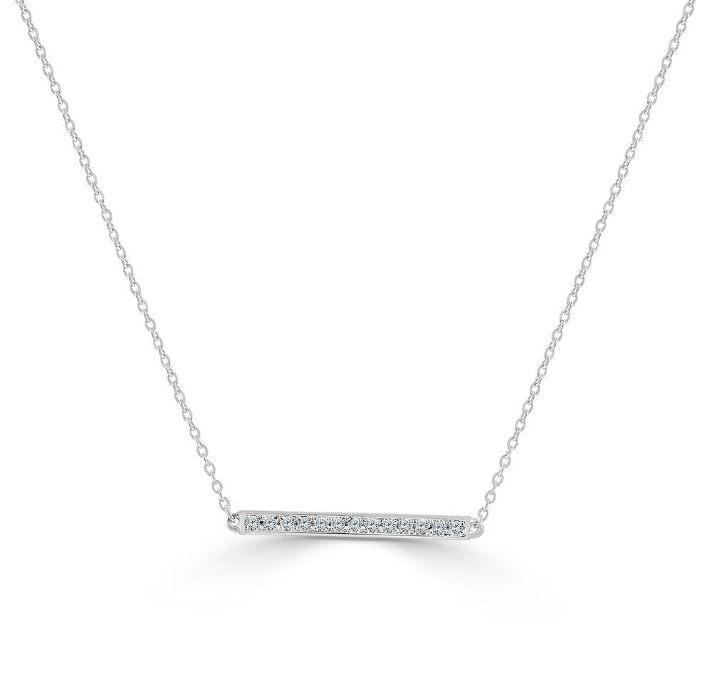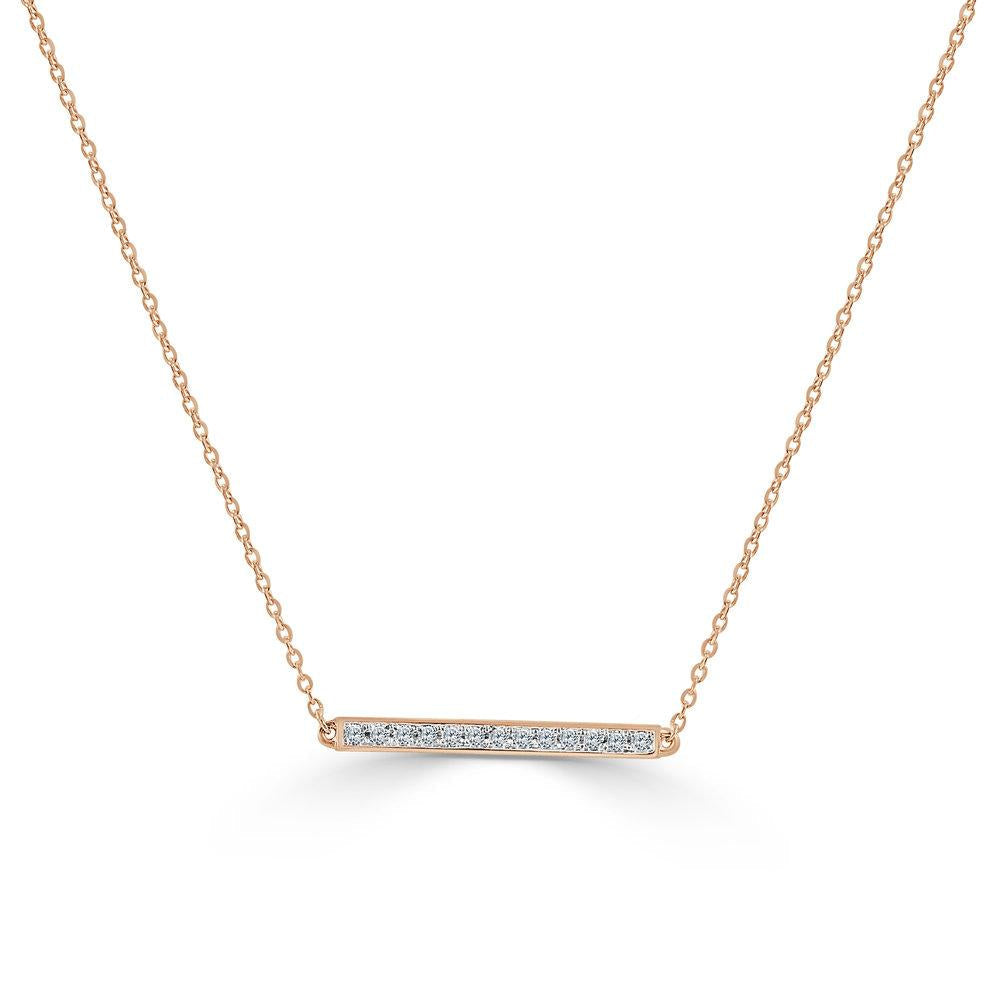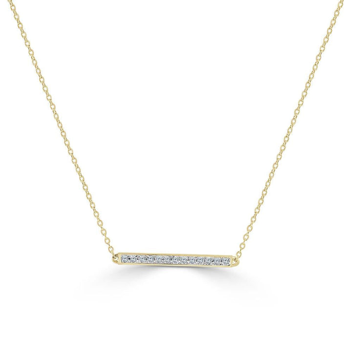 Crafted in 14k gold. Features natural round-cut diamonds totaling 0.10 ct. t.w. Adjustable chain length: 16"-18". Bar dimensions: 0.4" length, 0.1" width.