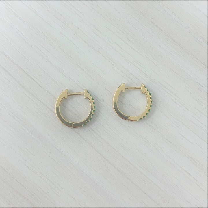 These 14k Gold & Emerald Huggie Earrings by Sabrina Designs bring a vibrant touch of elegance to a classic silhouette. The lush green hue of the emeralds adds a rich contrast against the warm glow of gold, making these petite huggies a luxurious everyday essential. Their sleek and refined design ensures they pair effortlessly with any look.