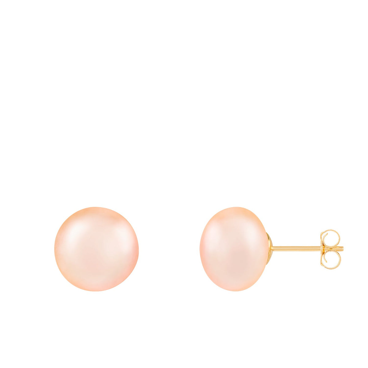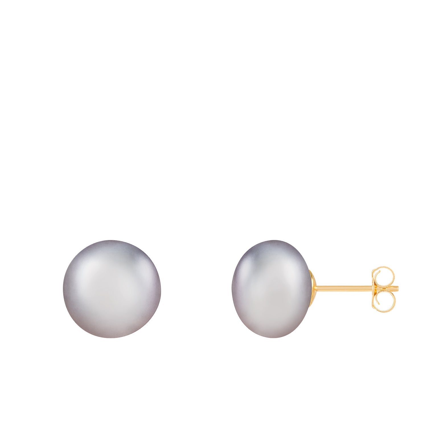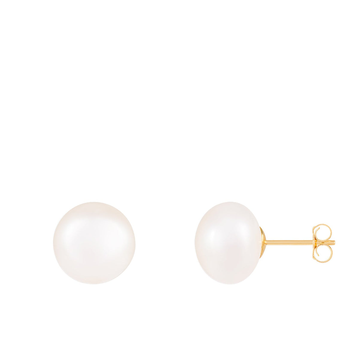 Handcrafted in 14k yellow gold. Features 10-11mm button-shaped freshwater pearls. Secured with friction backs.