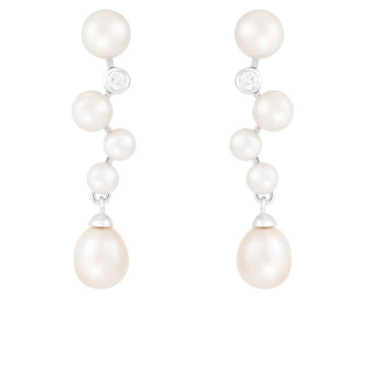 Handcrafted in sterling silver with rhodium plating for added shine and durability. Features a trio of white freshwater pearls in graduated sizes: 4-5mm, 6-7mm, and 7-8mm. Secured with friction backings for a comfortable and secure fit.