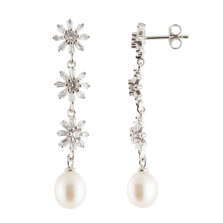 Crafted in sterling silver with rhodium plating for enhanced shine. Features 7.5-8mm white freshwater pearls, accented by a sparkling CZ cluster. Secured with friction backs for a comfortable and secure fit.