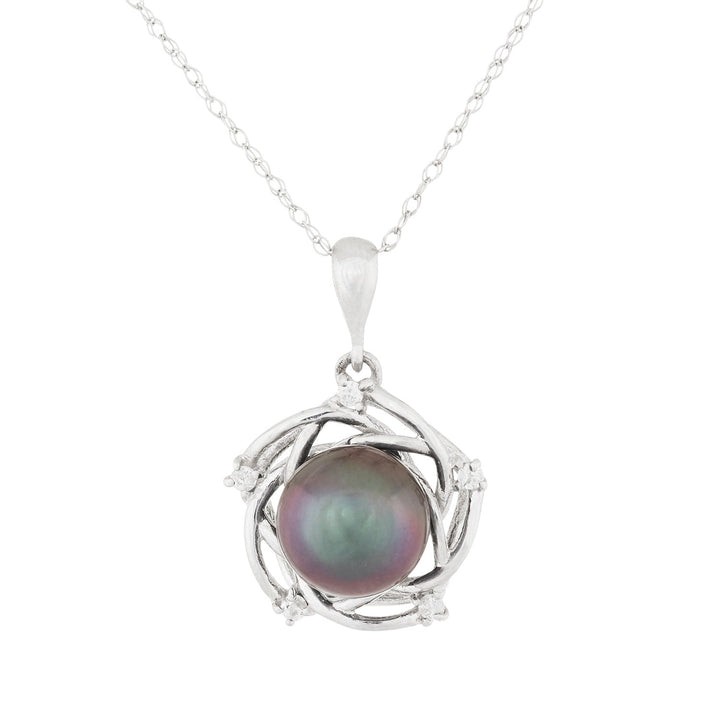 Handcrafted in 14k white gold with a polished finish. Features an 8-8.5mm black Tahitian pearl with a rich, lustrous surface. Accented by .075CT DTW diamonds (I1 quality, G-H color). Suspended from a 17-inch chain with a spring ring clasp for secure fastening.