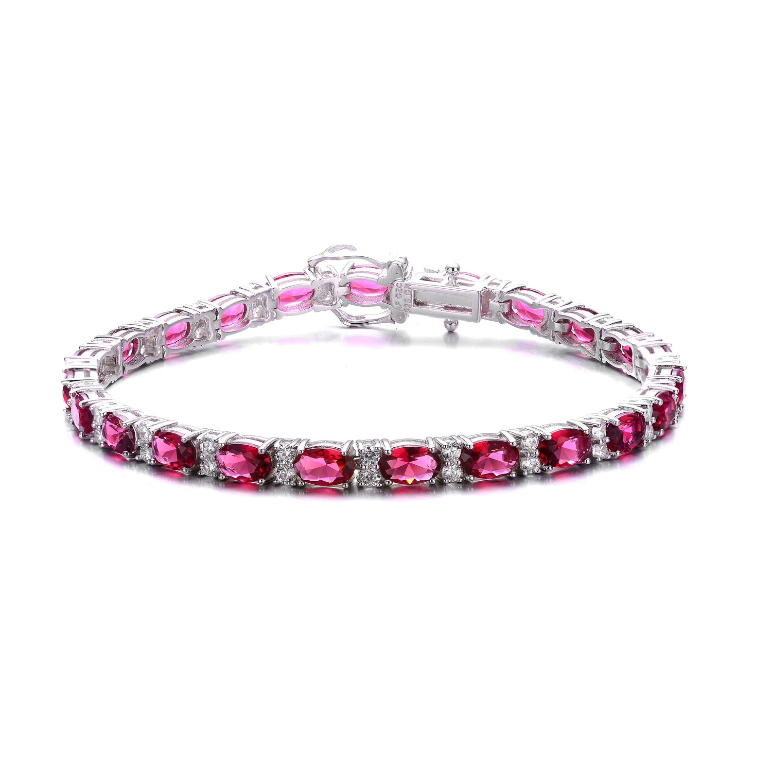 This Genevive Jewelry Sterling Silver Ruby Cubic Zirconia Tennis Bracelet reimagines a timeless design with alternating clear and colored oval-shaped stones. The harmonious contrast between the shimmering cubic zirconia and rich hues creates a dazzling display of elegance. A sophisticated choice for any occasion.