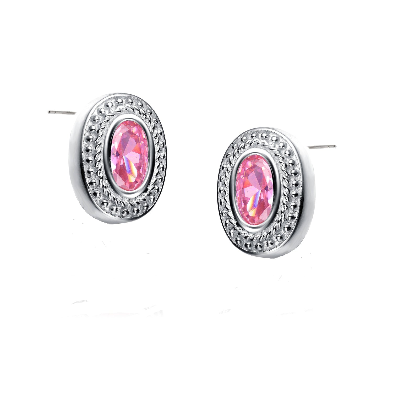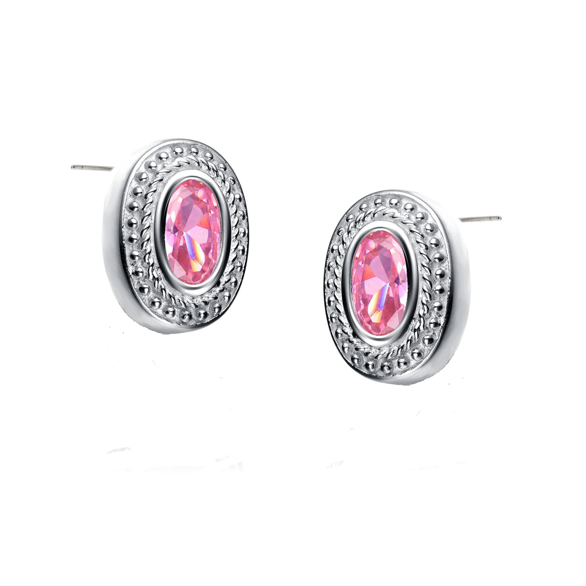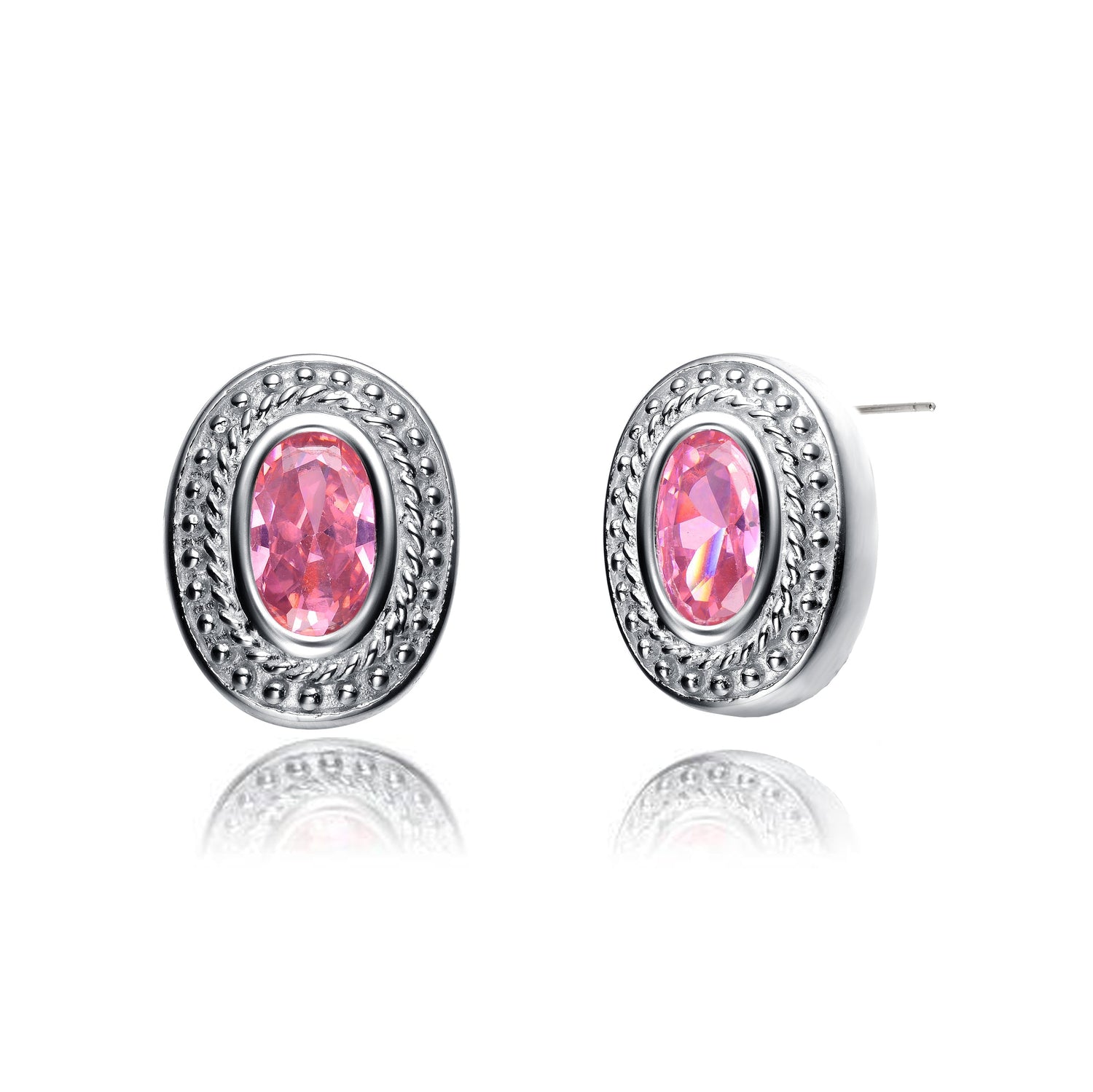 Made in sterling silver with rhodium plating for enhanced durability. Features oval-cut pink cubic zirconia stones in a decorative bezel setting. Secured with butterfly closures for a comfortable fit.