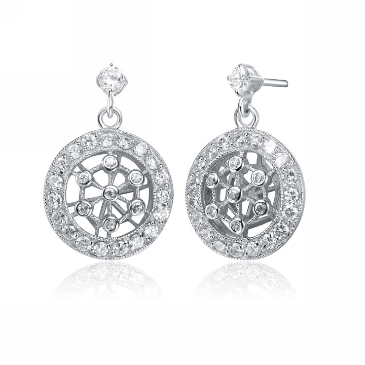 These Genevive Sterling Silver Cubic Zirconia Round Drop Earrings blend intricate craftsmanship with timeless sparkle. The circular drop design features bezel-set cubic zirconia within an openwork lattice pattern, enhanced by a delicate milgrain border. A refined and sophisticated choice for any jewelry collection.