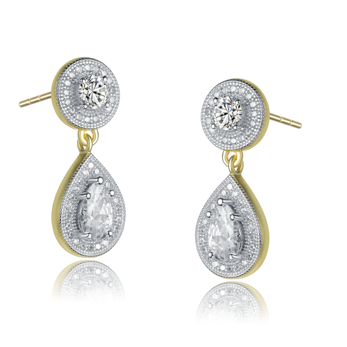 These Genevive Jewelry Sterling Silver Gold Plated Cubic Zirconia Teardrop Earrings bring graceful elegance to any look. A dazzling pear-cut cubic zirconia sits at the center, framed by shimmering round stones that enhance its radiance. The blend of rhodium and gold plating adds warmth and depth to the design.